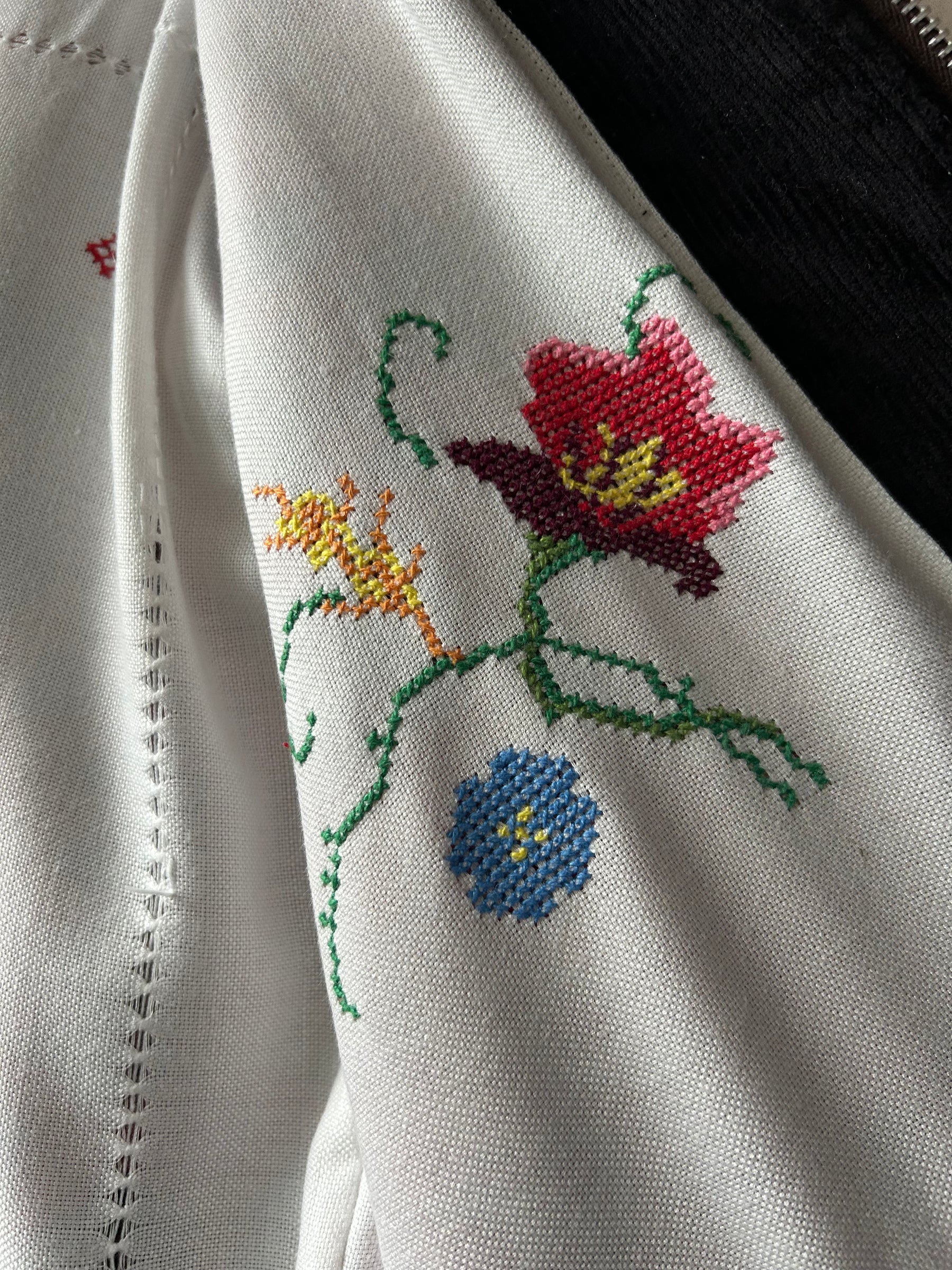 • Lined with a vintage hand-embroidered linen tablecloth.