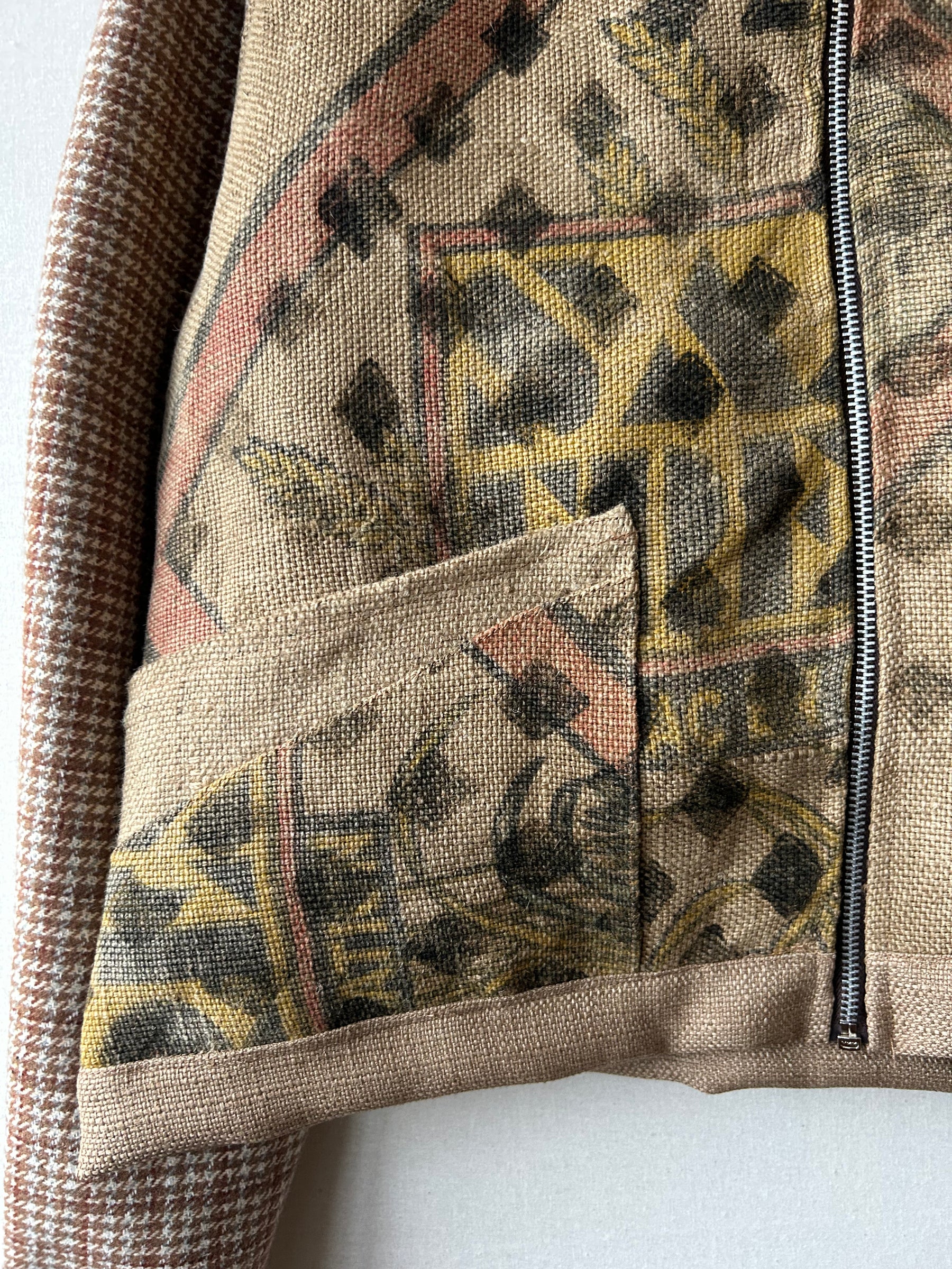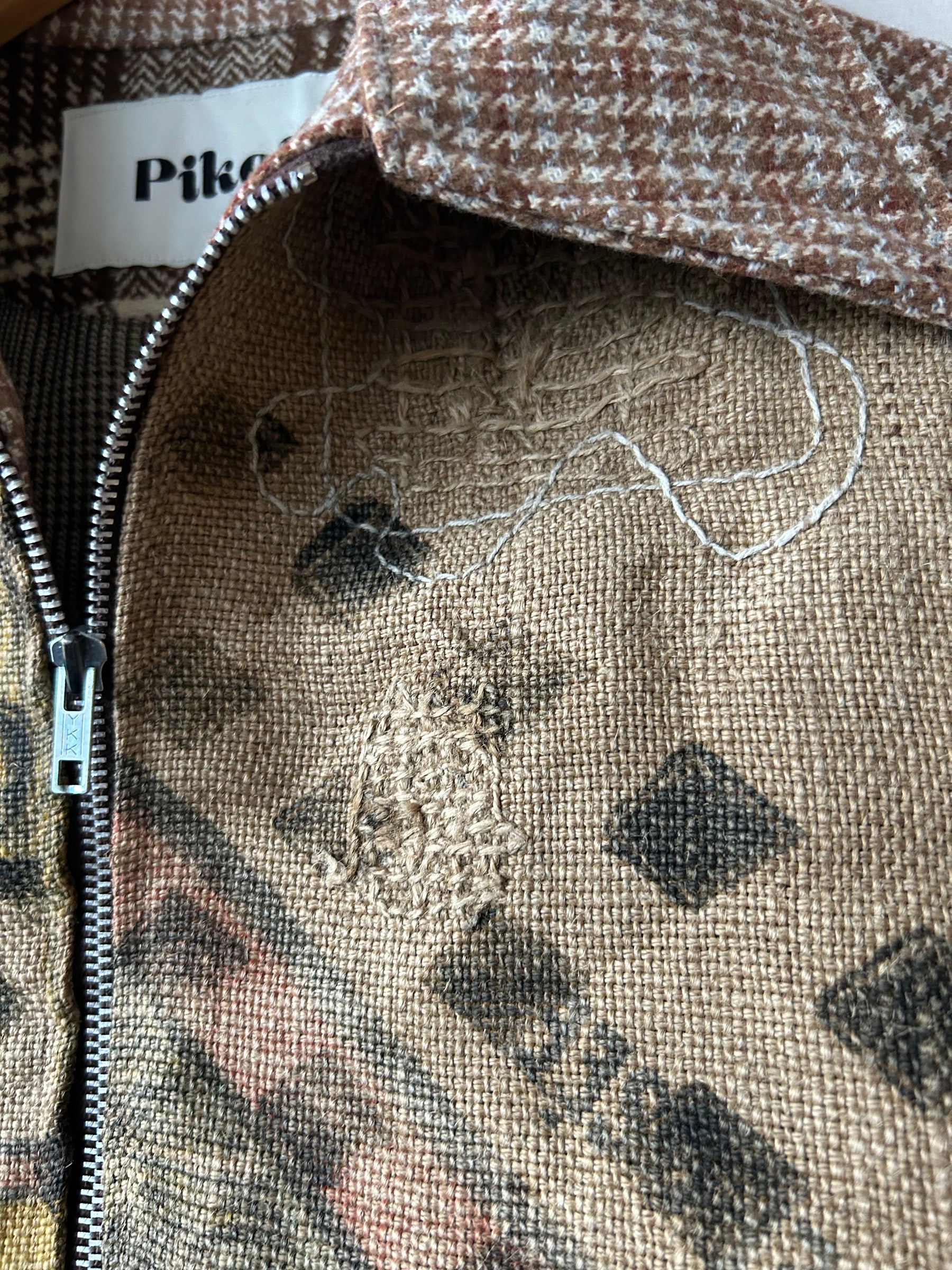 Jacket made from vintage grain sacks. Fabric used has imperfections and instances of hand-mending.