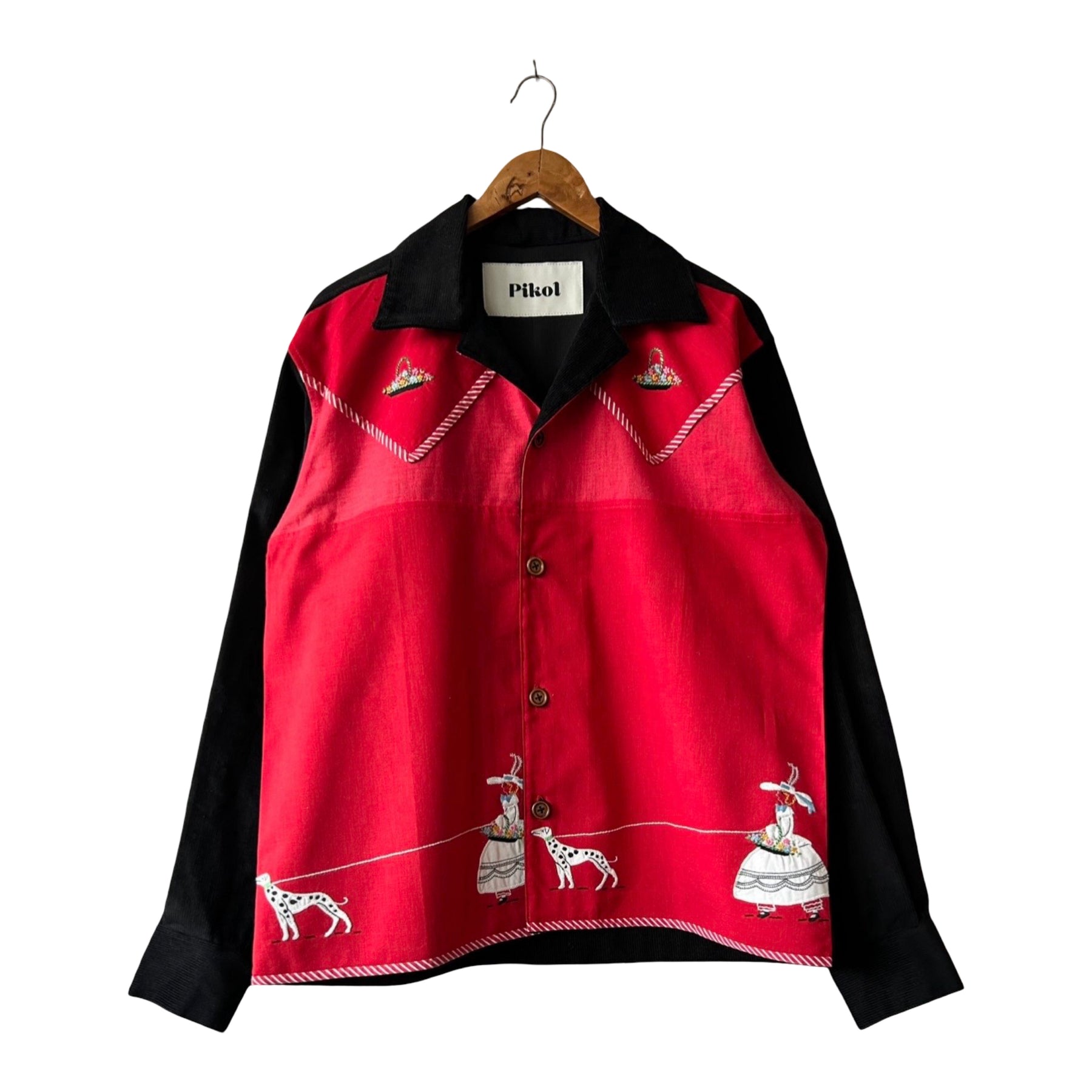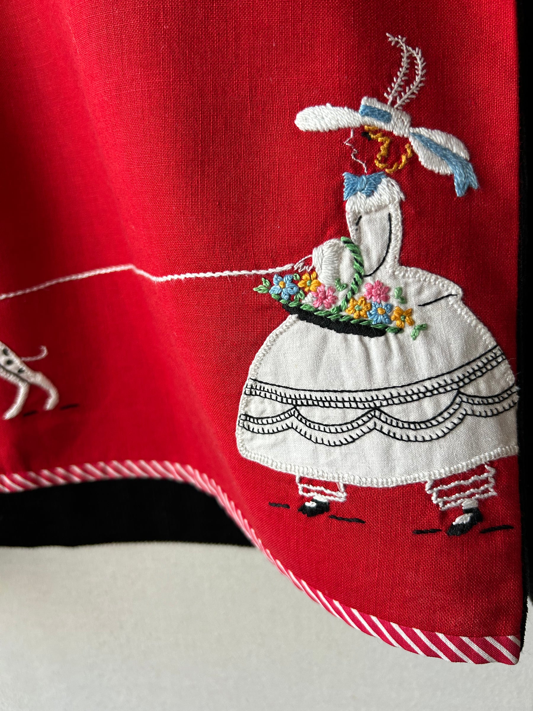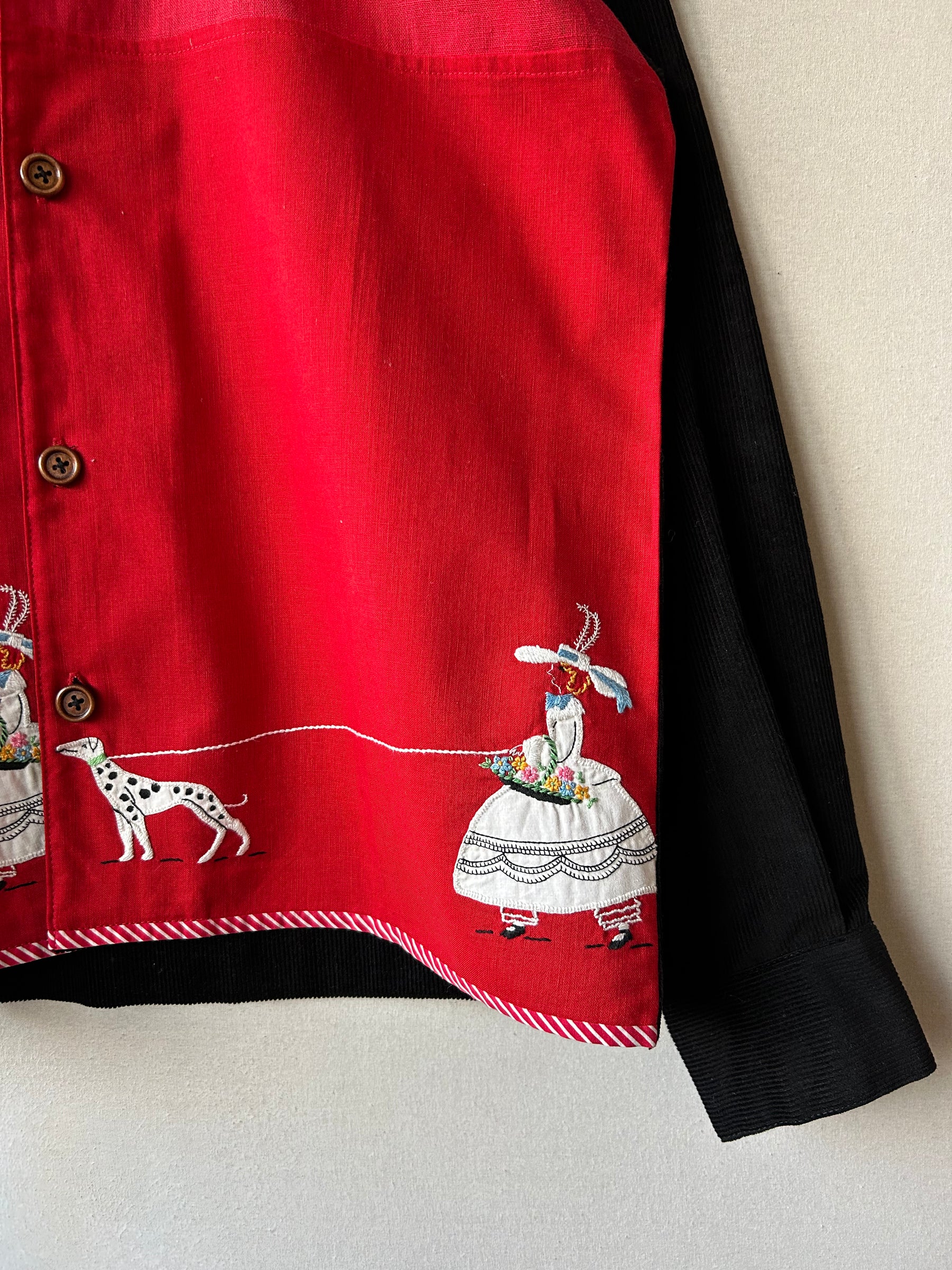 Hand embroidered figures and Dalmatians, with flowers on the shoulders