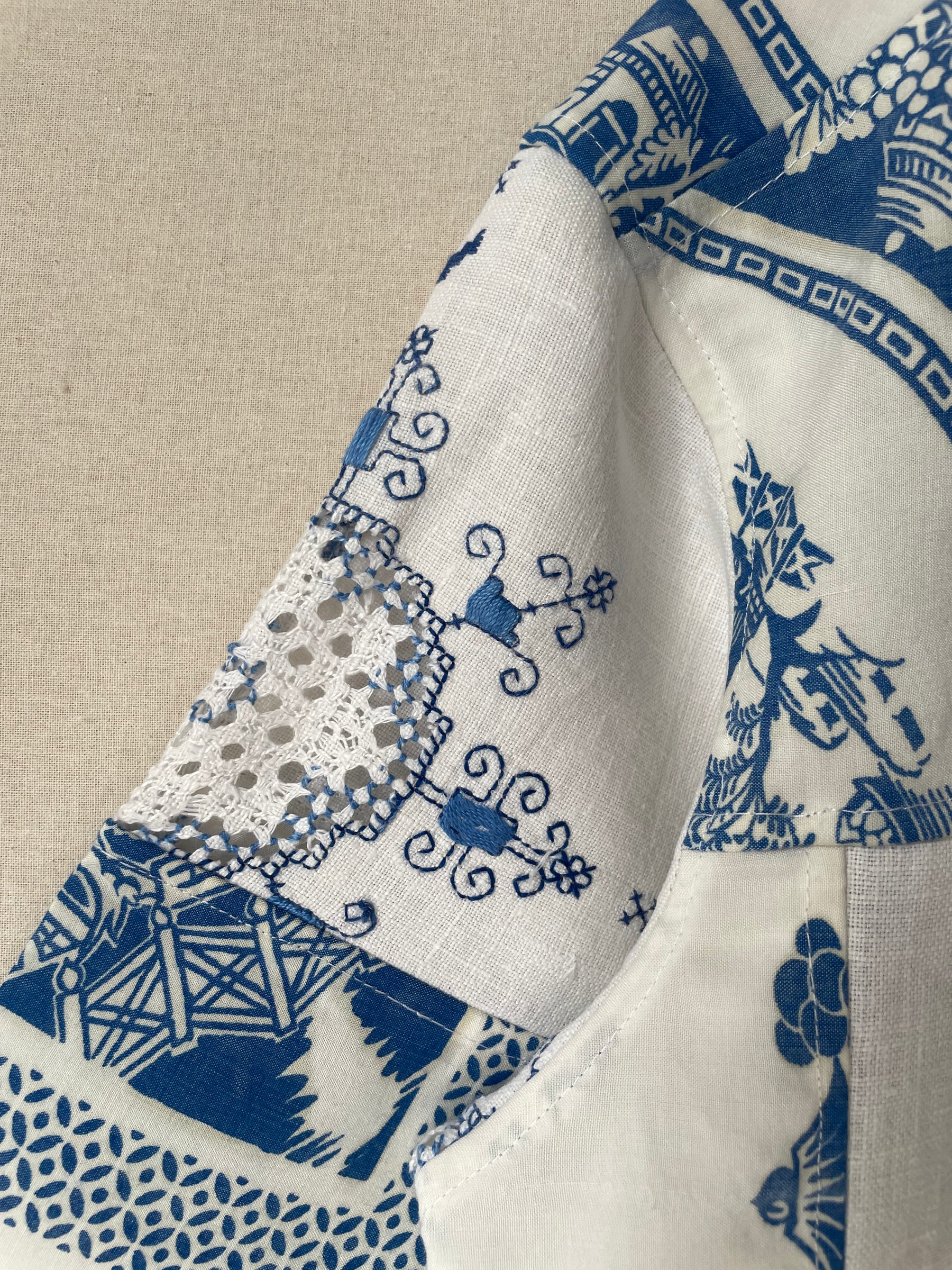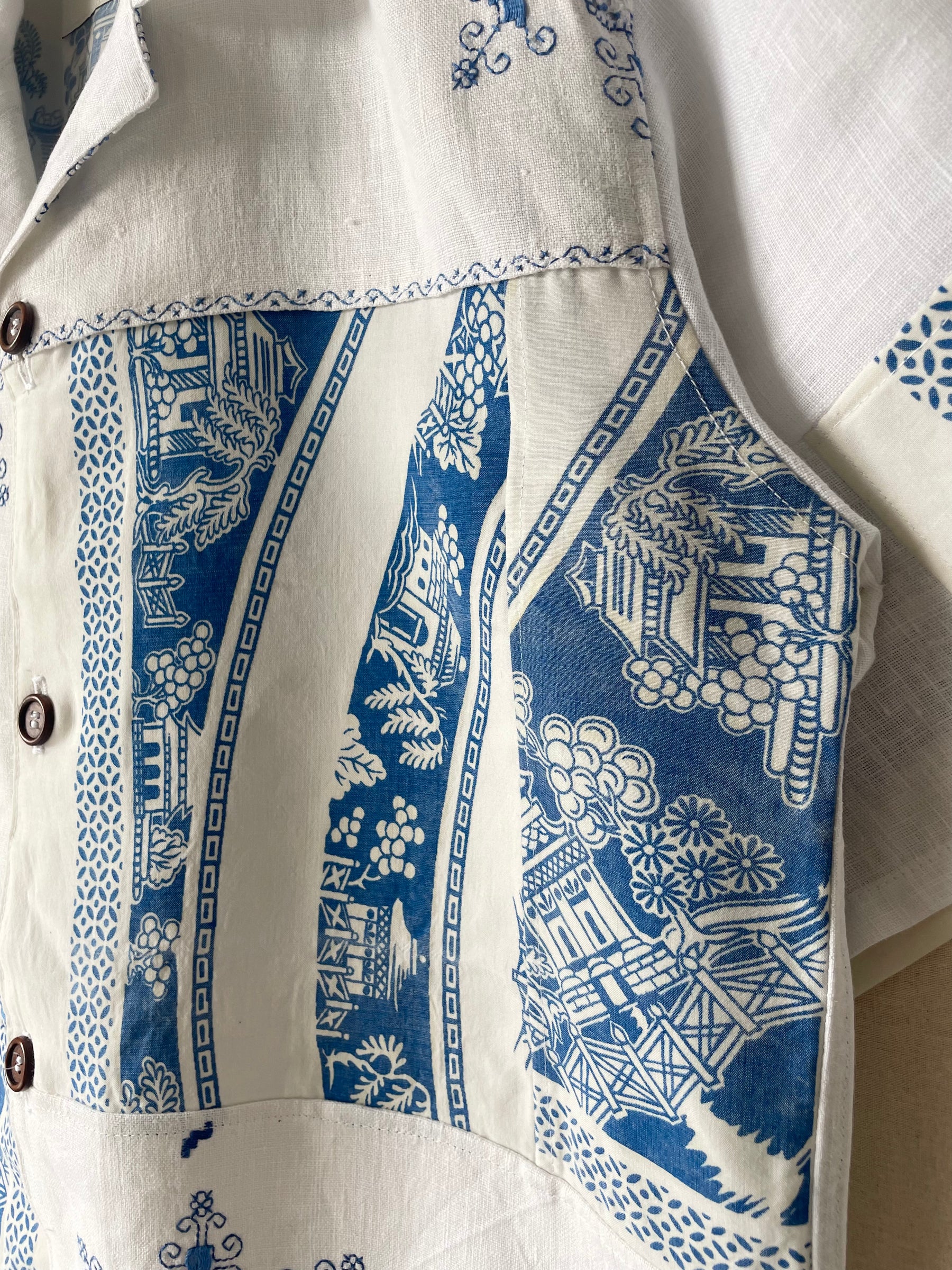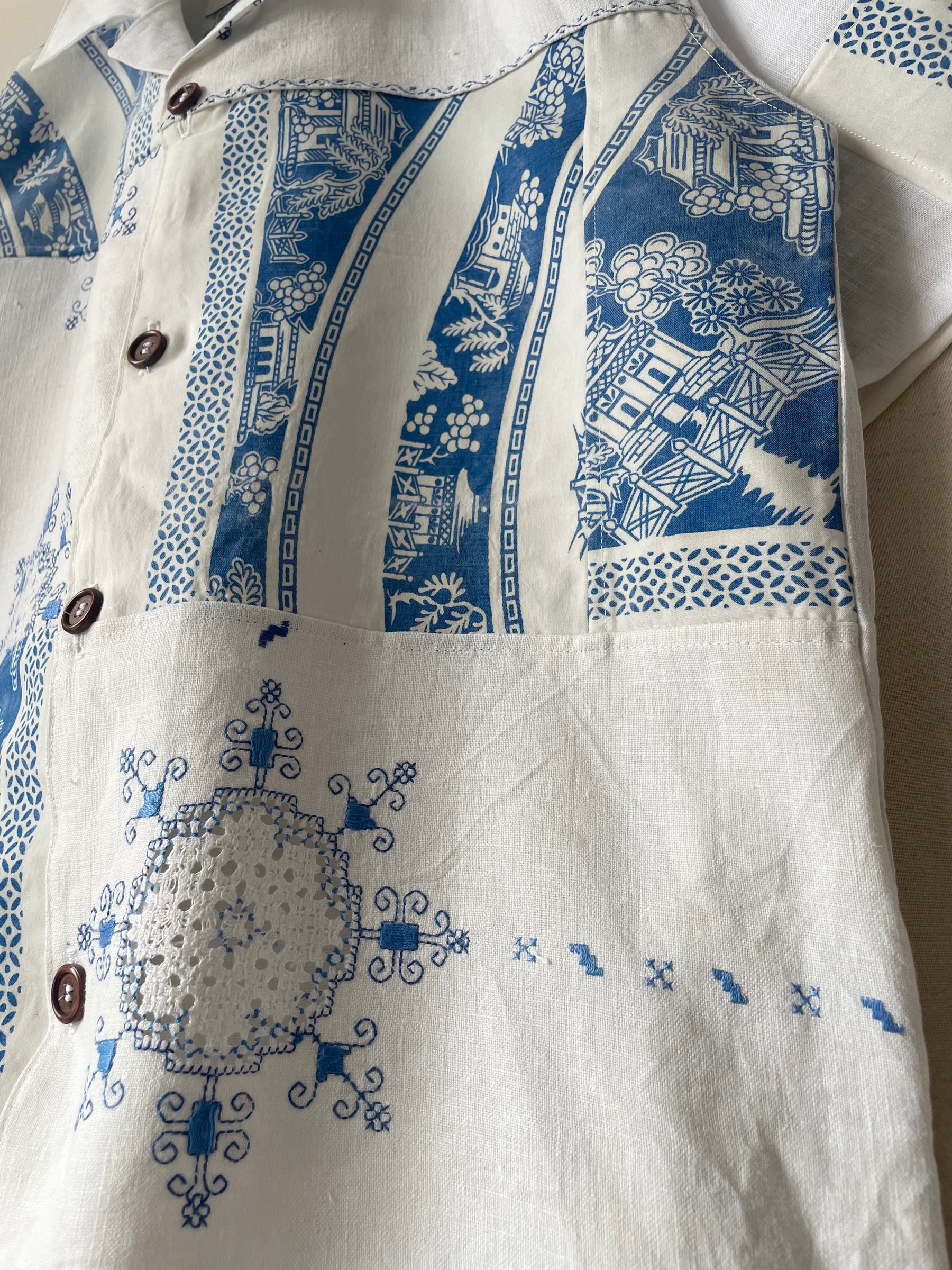 Shirt made from vintage linen tablecloths. Fabric used may have slight imperfections