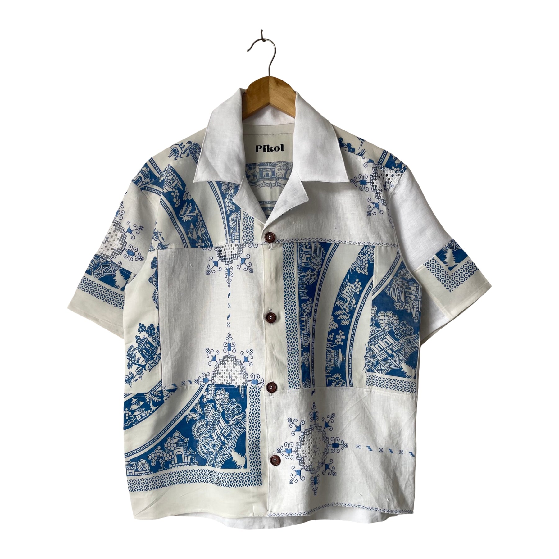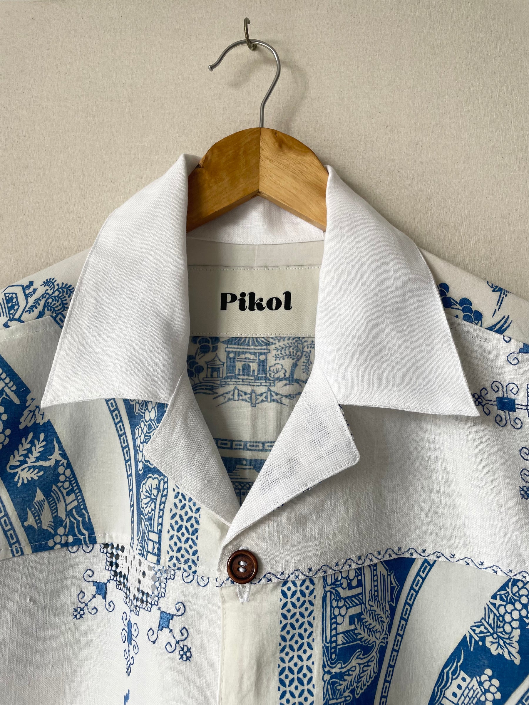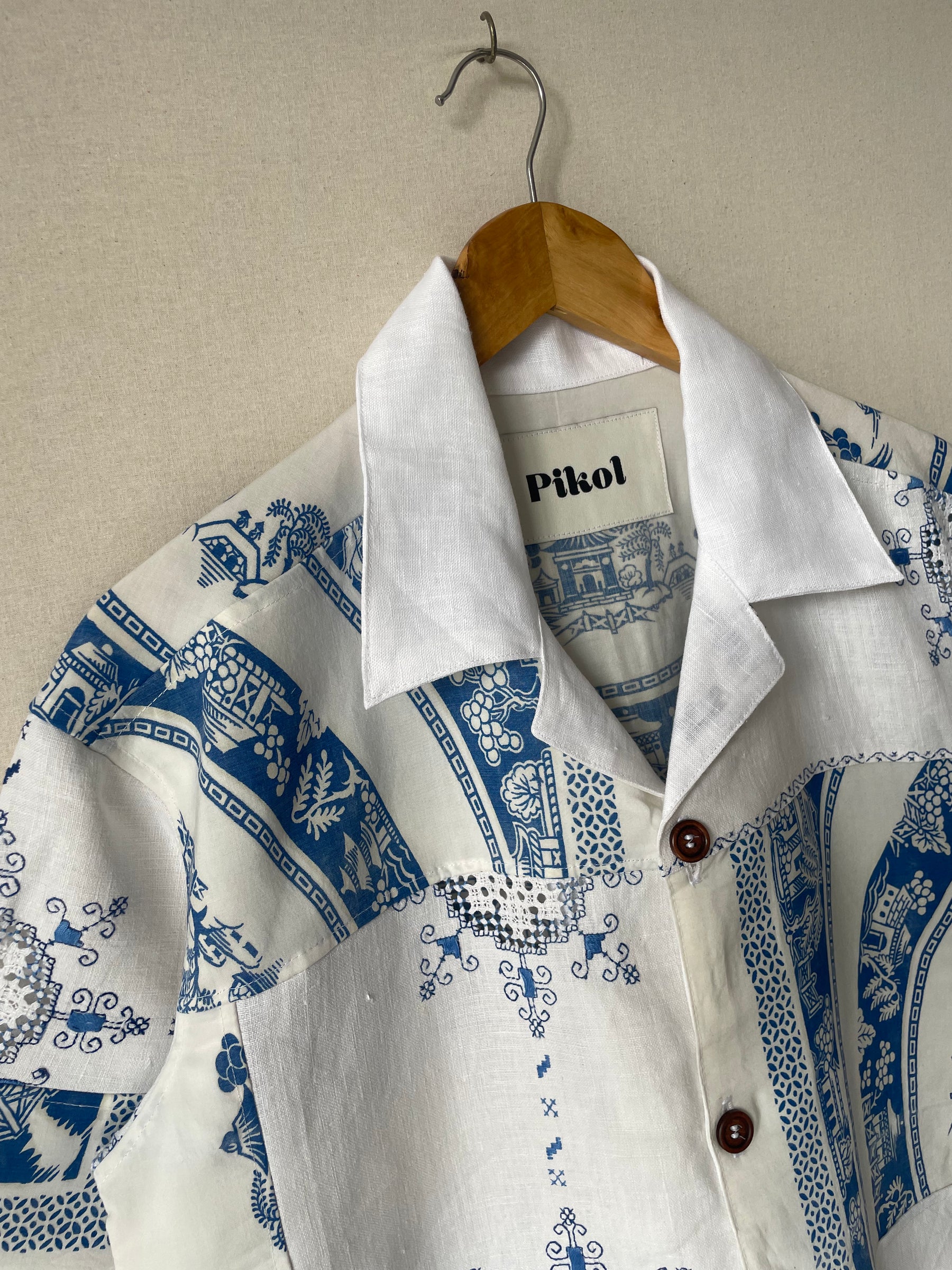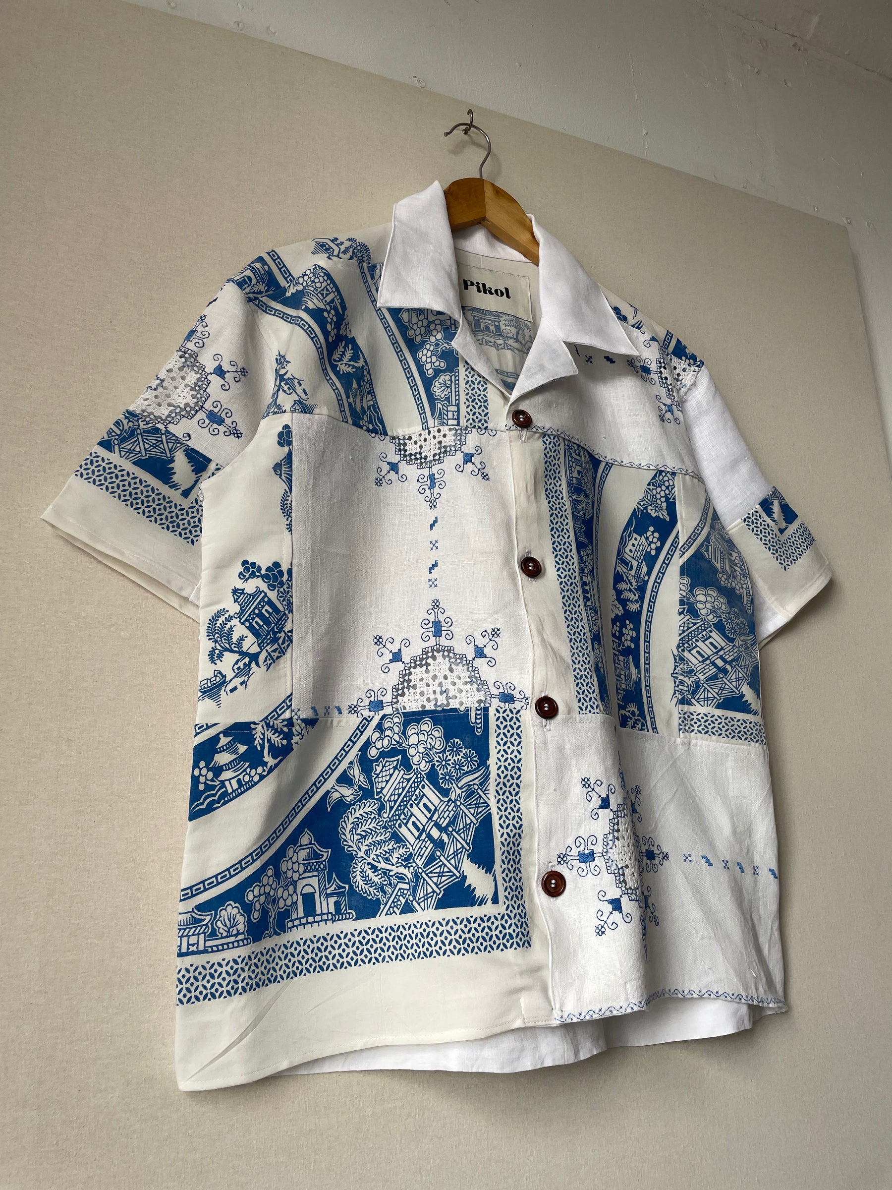 Shirt made from vintage linen tablecloths. Fabric used may have slight imperfections
