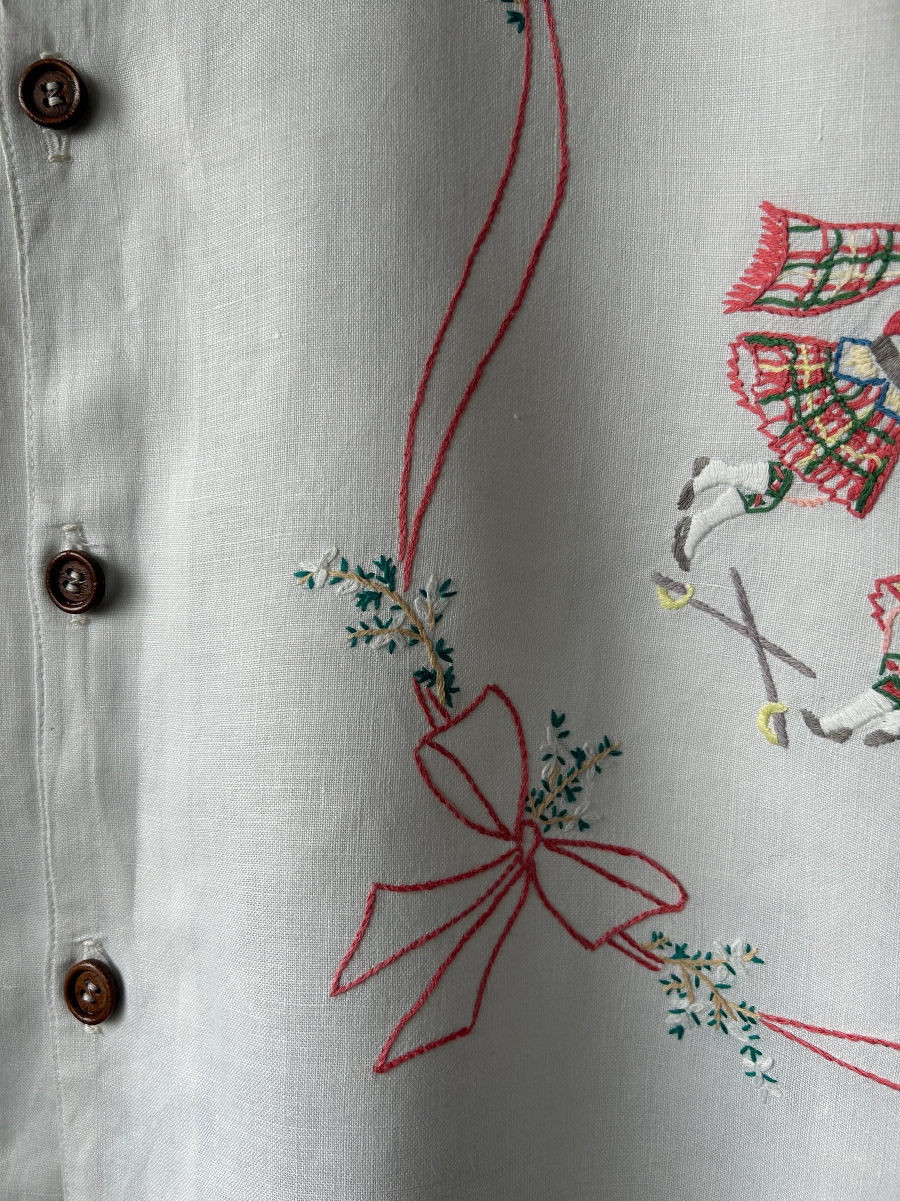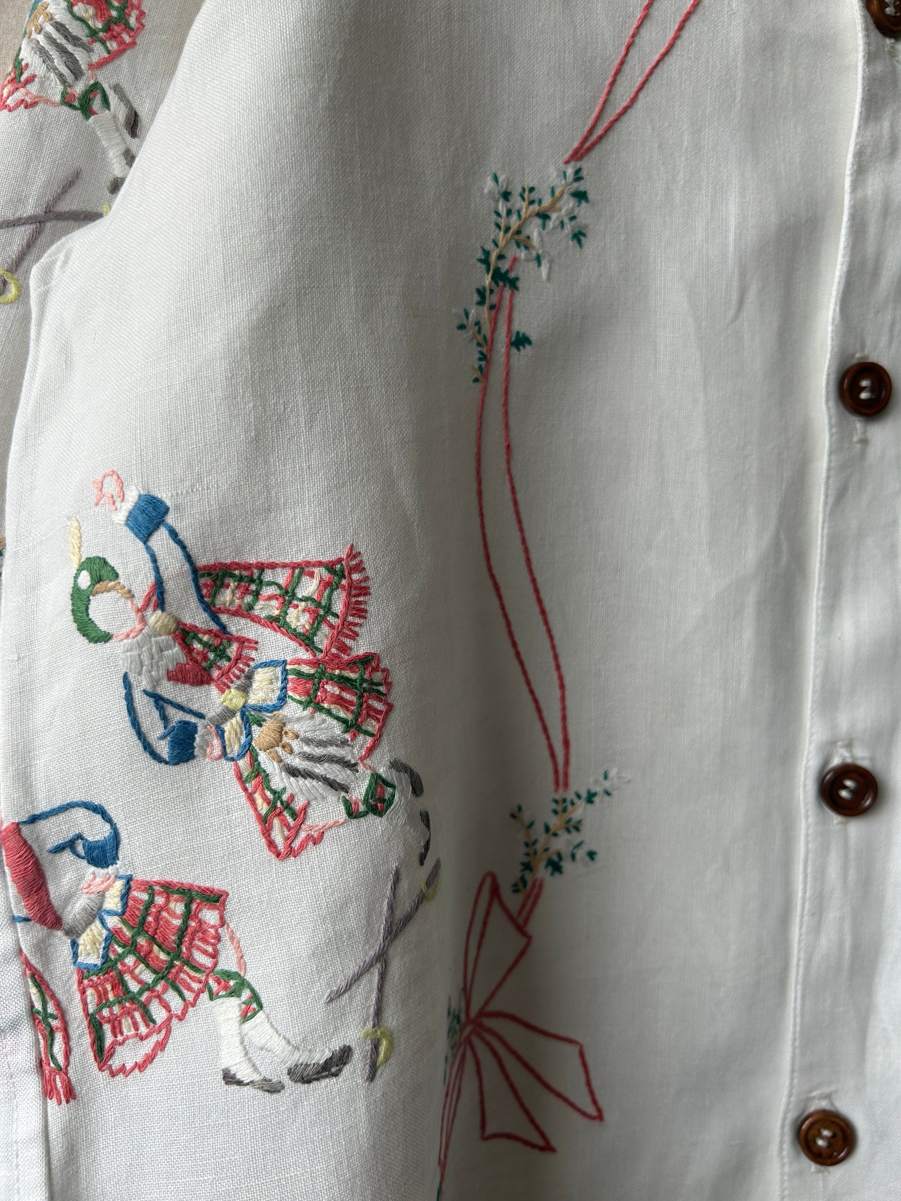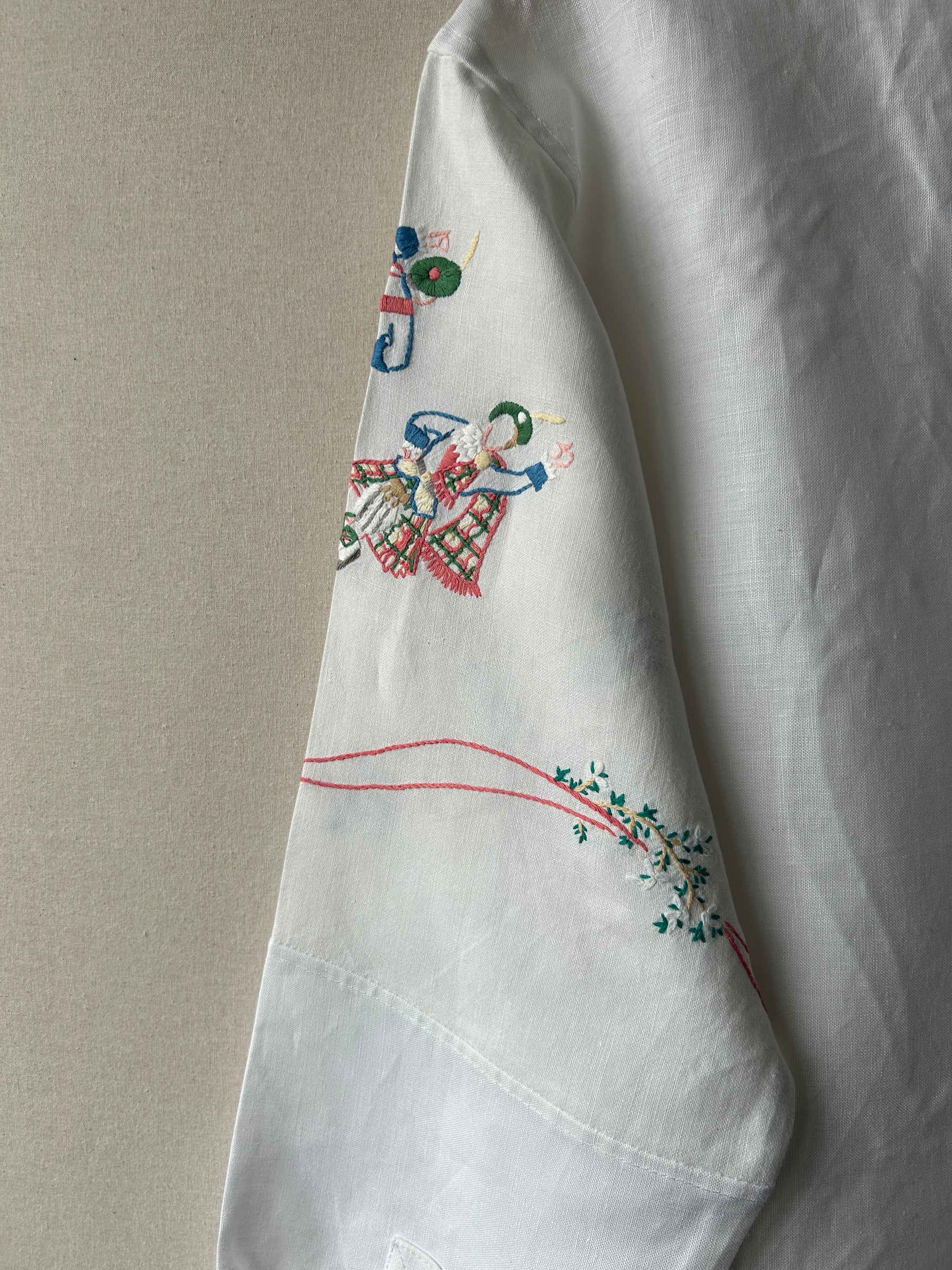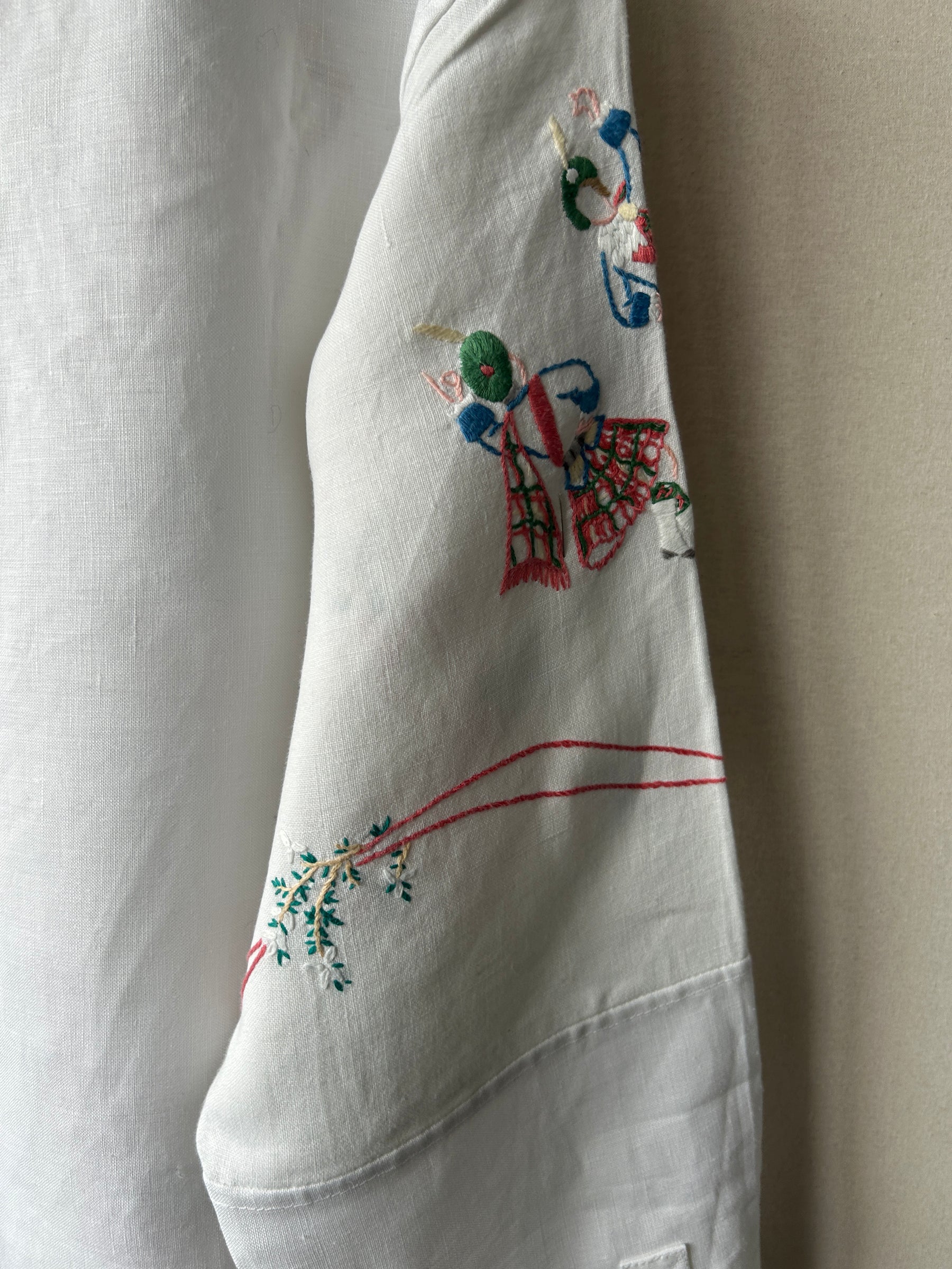 Shirt made from a vintage linen tablecloth. Fabric used may have slight imperfections including some hand mending on the arm
