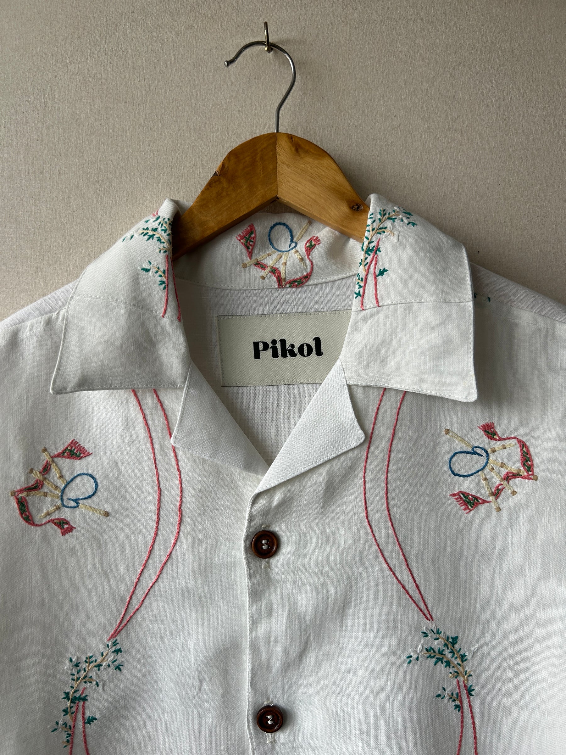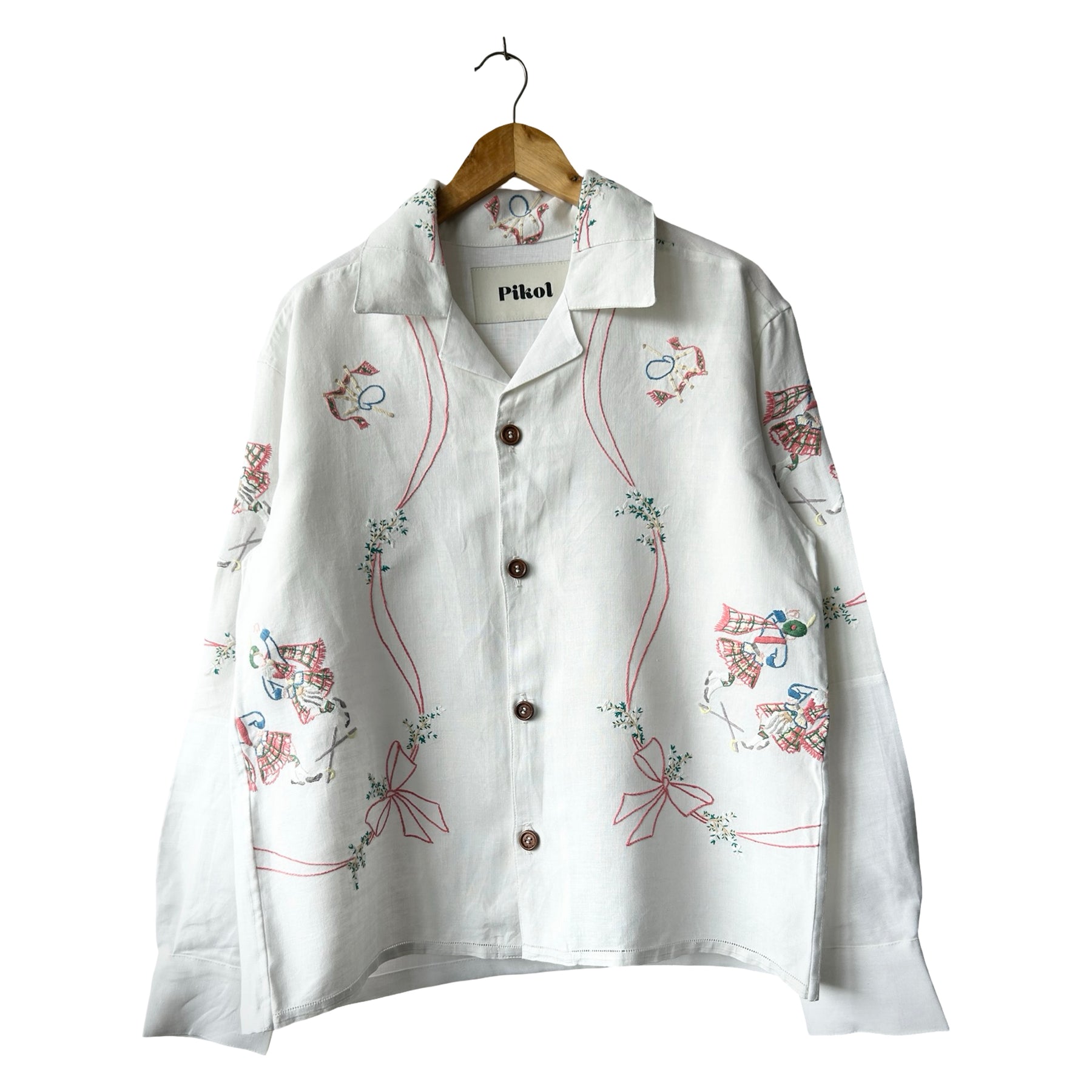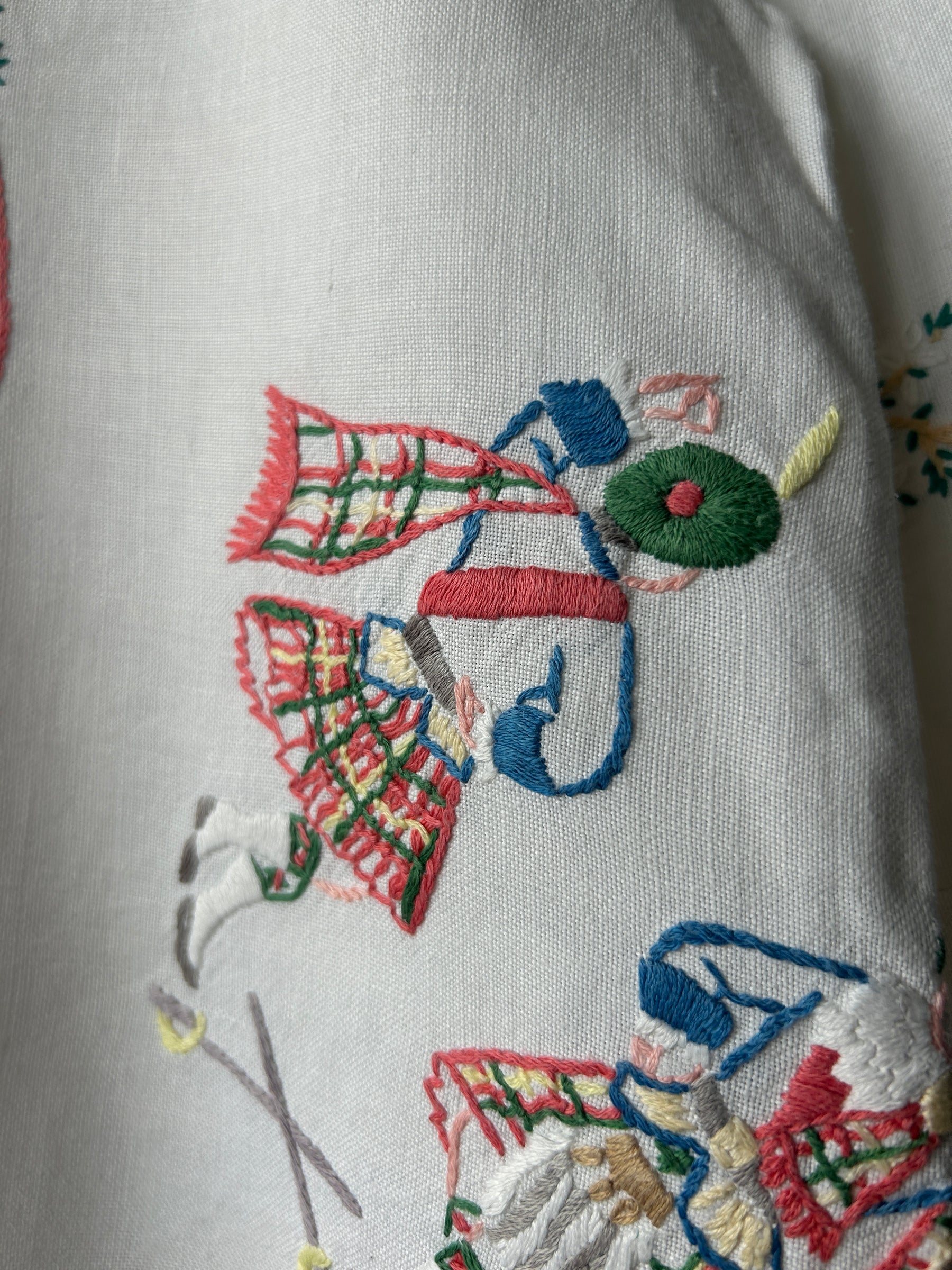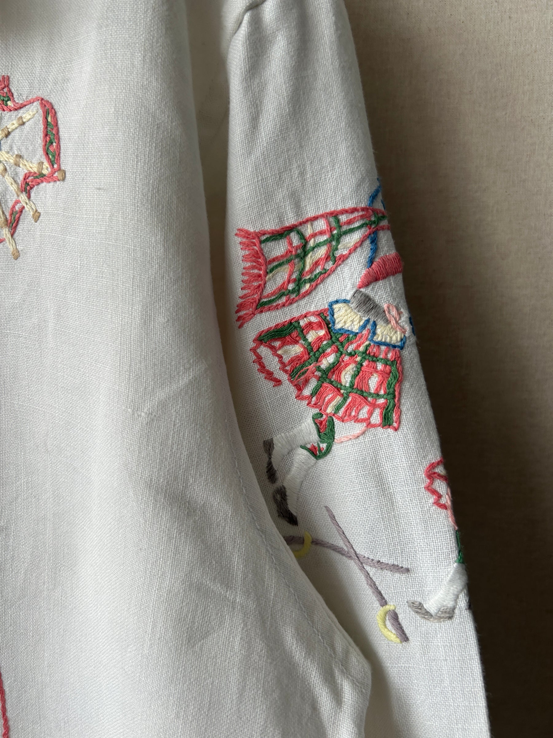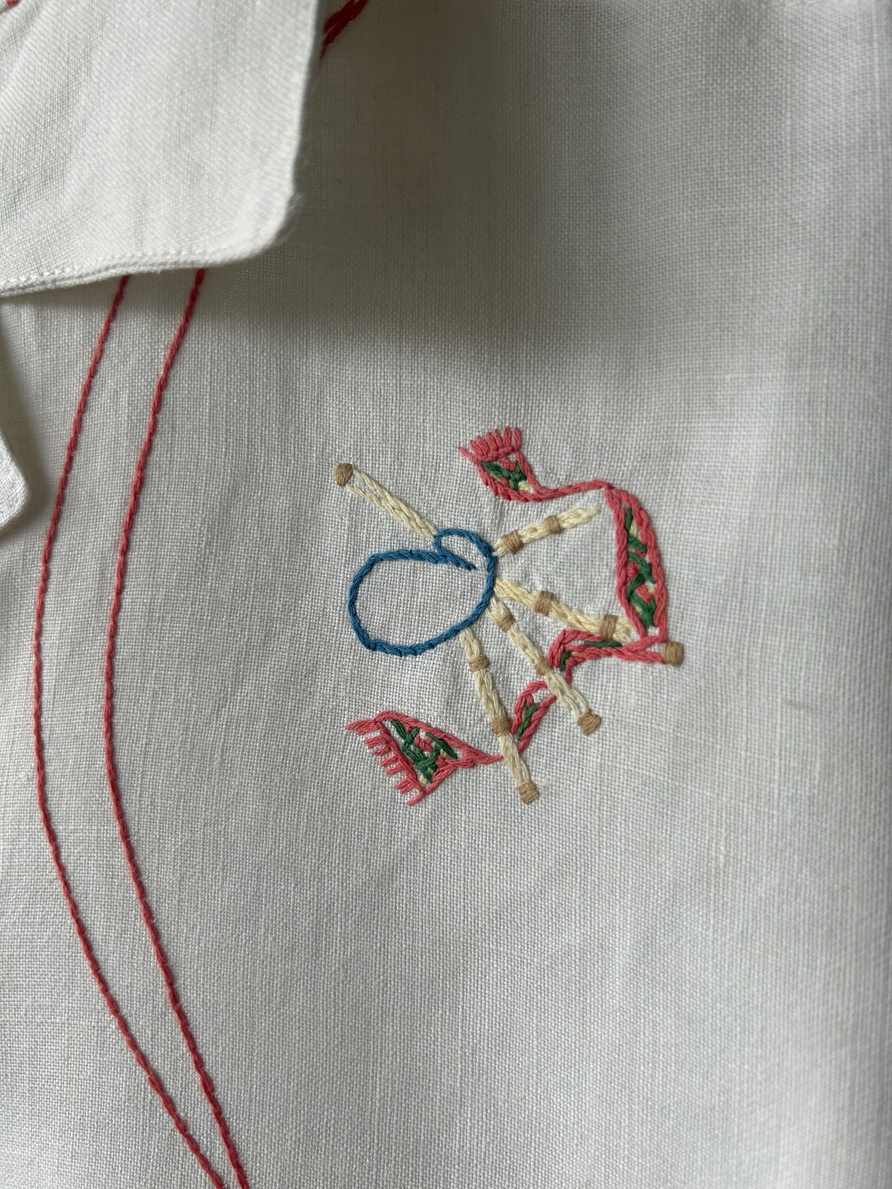 Shirt made from a vintage linen tablecloth. Fabric used may have slight imperfections including some hand mending on the arm
