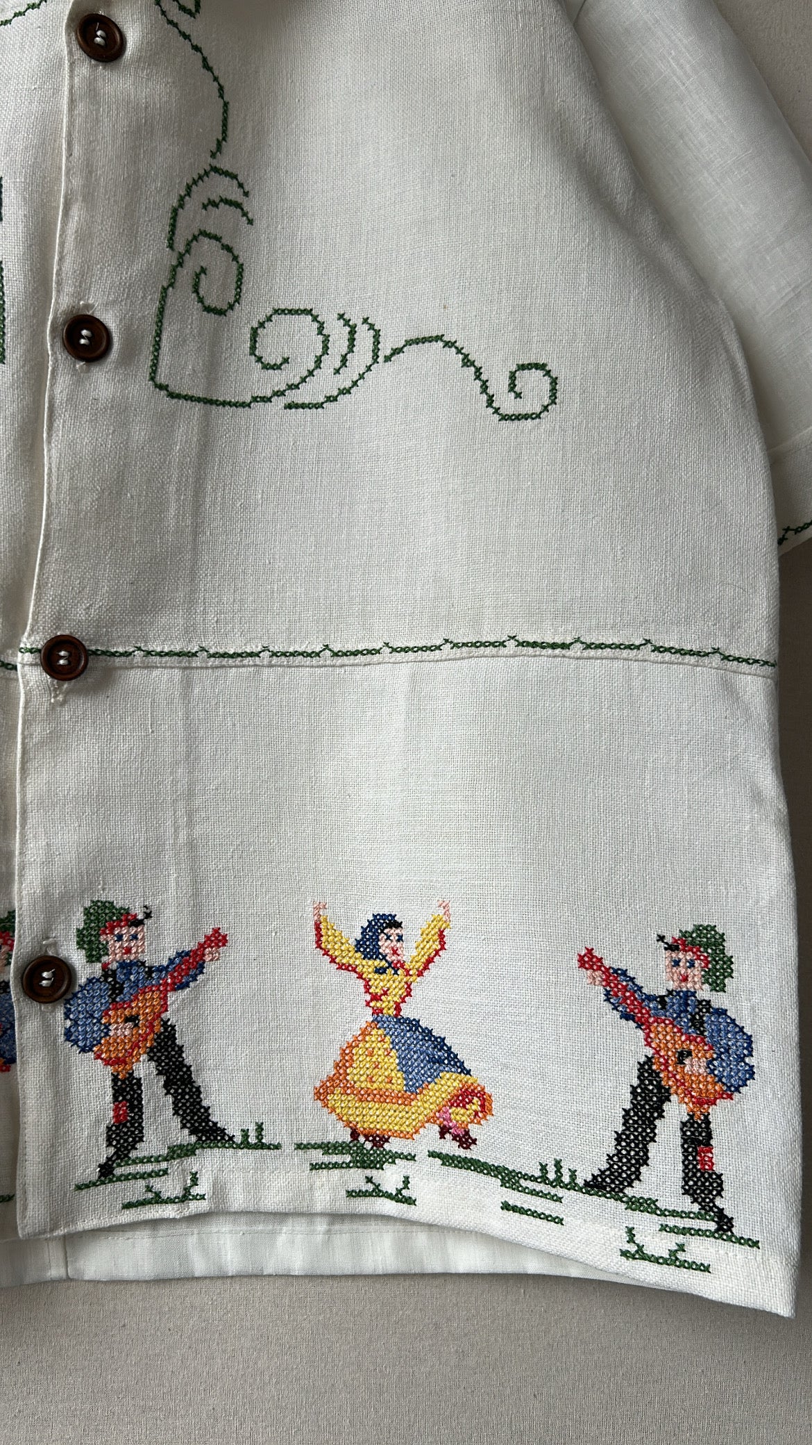 Detailed hand cross-stitched dancers and guitarists