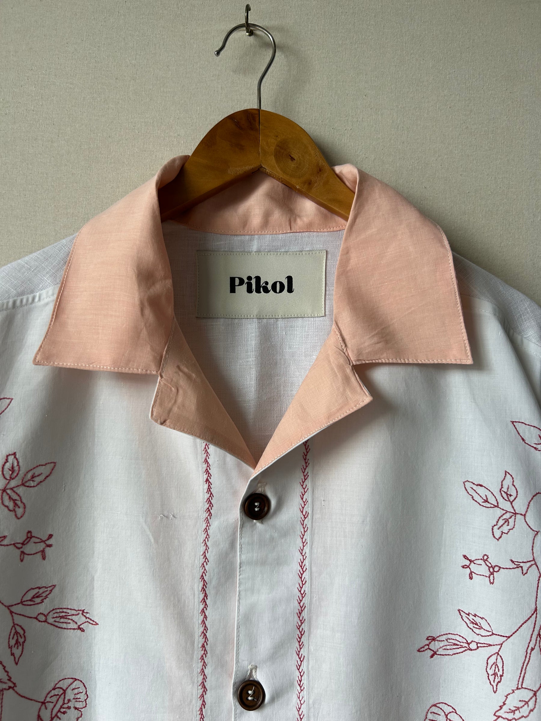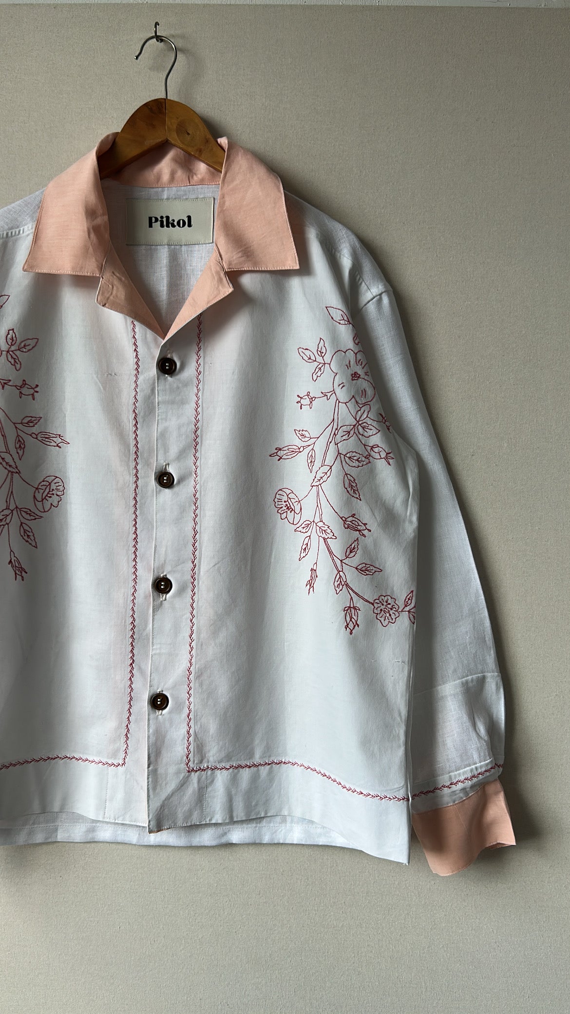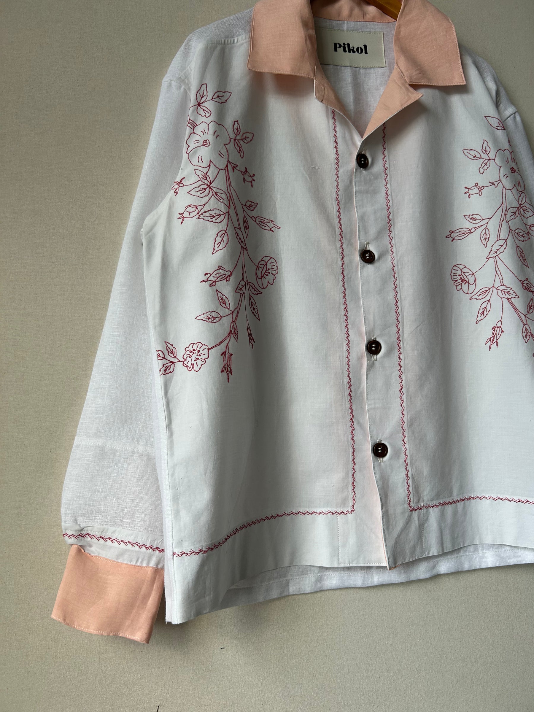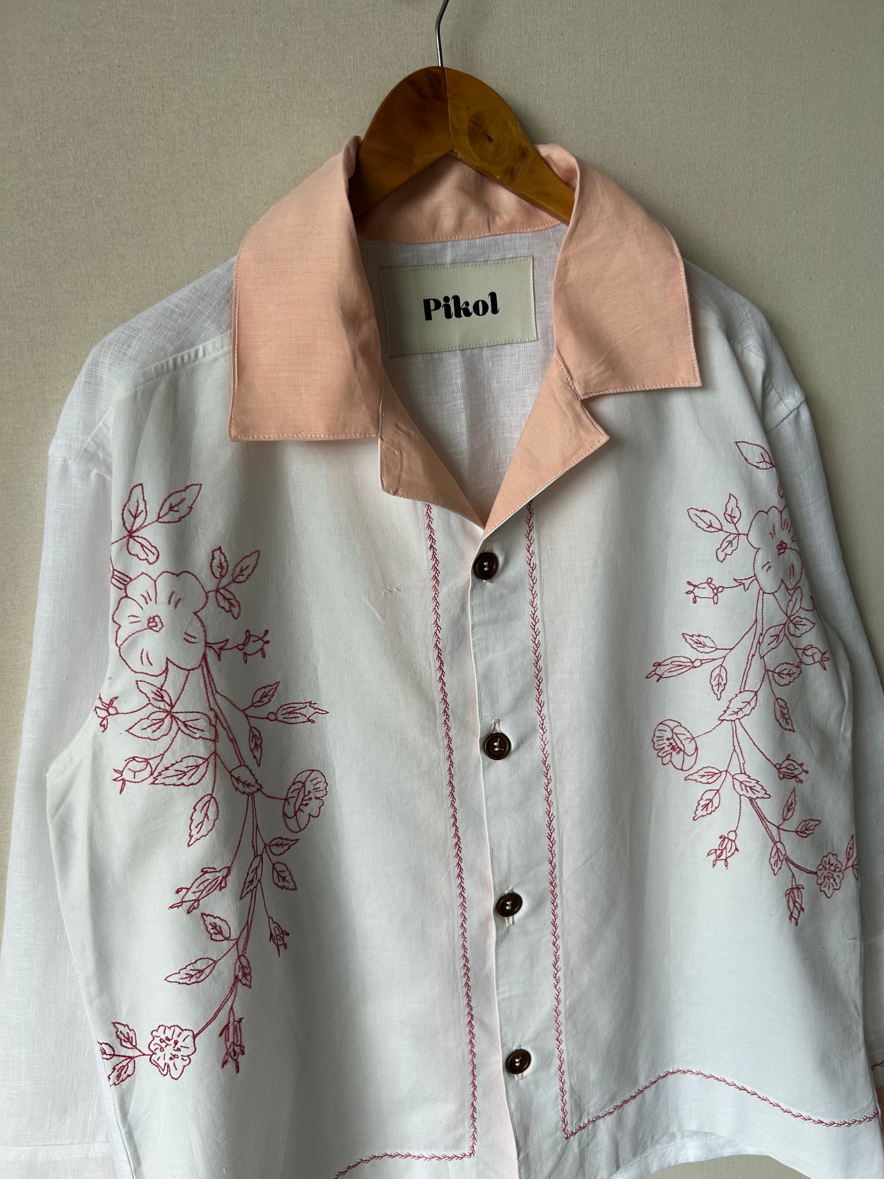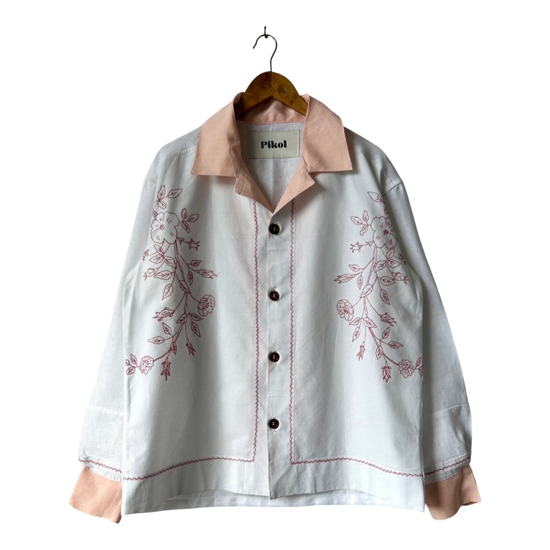 Shirt made from a vintage linen tablecloth. Fabric used may have slight imperfections