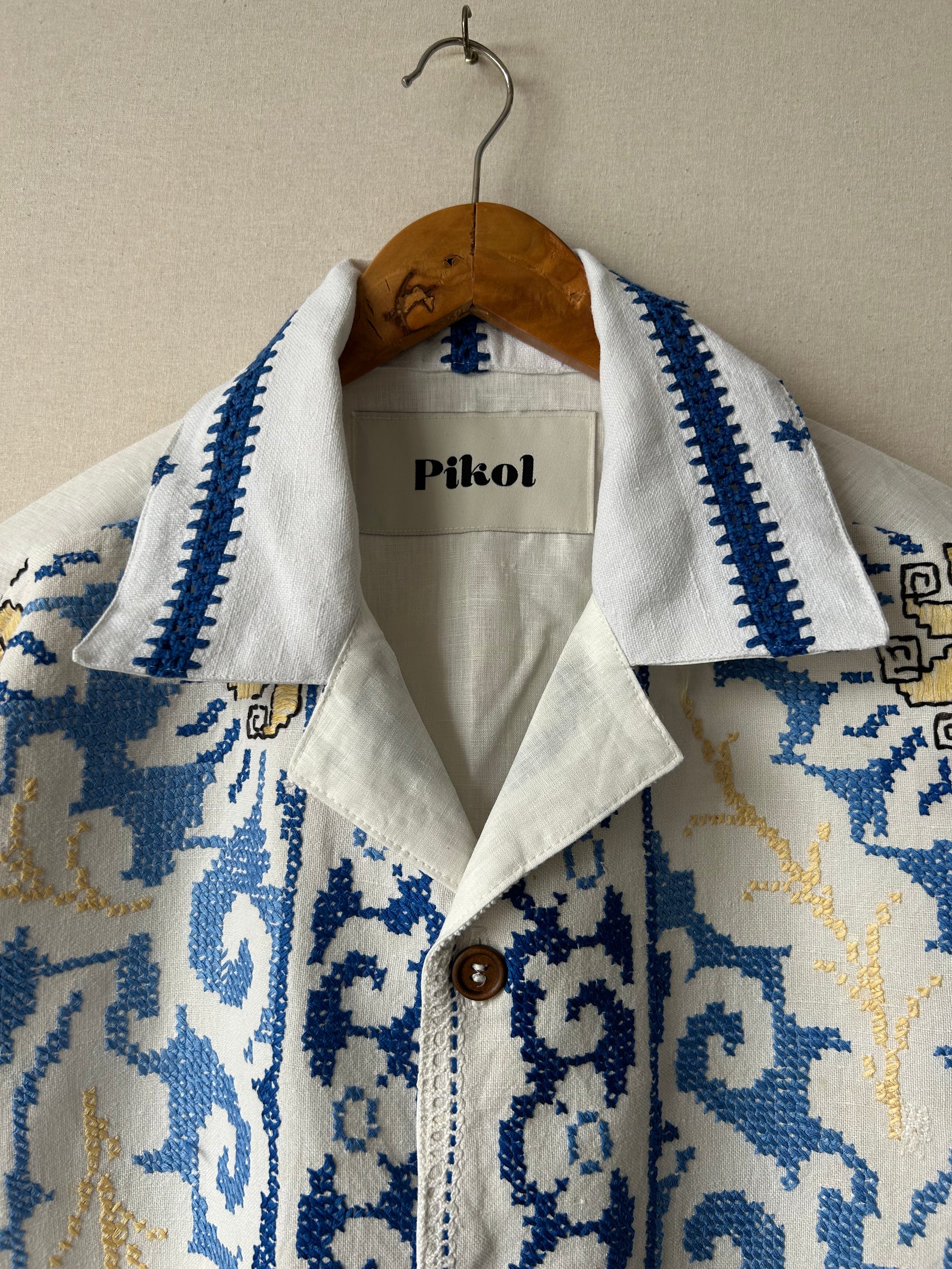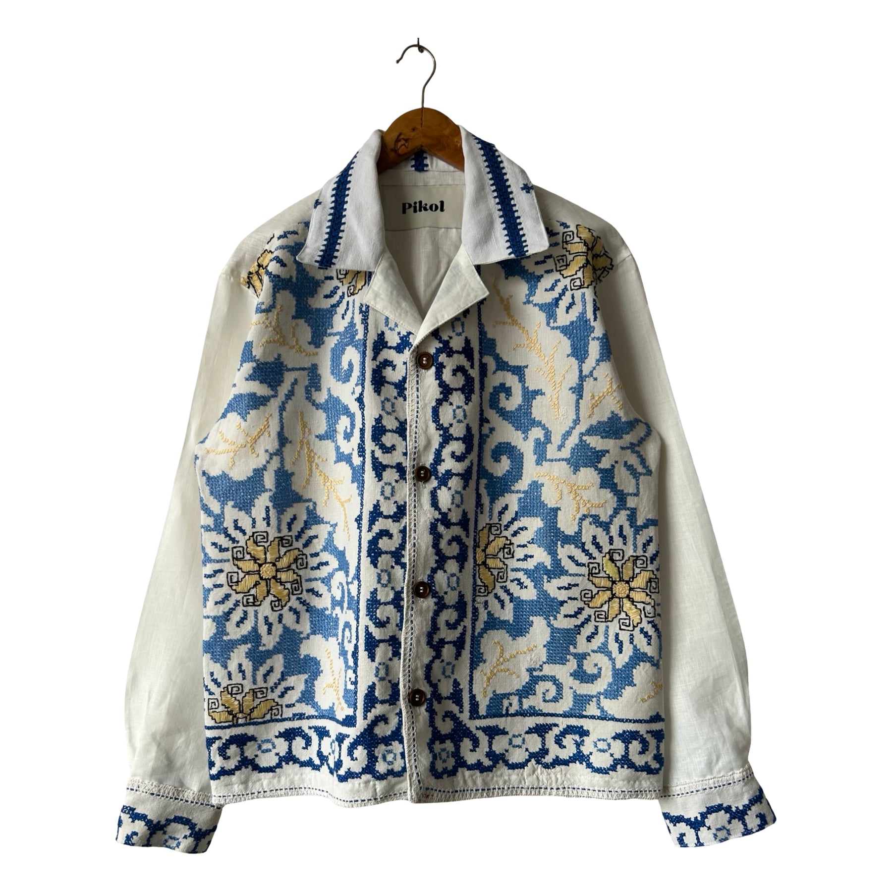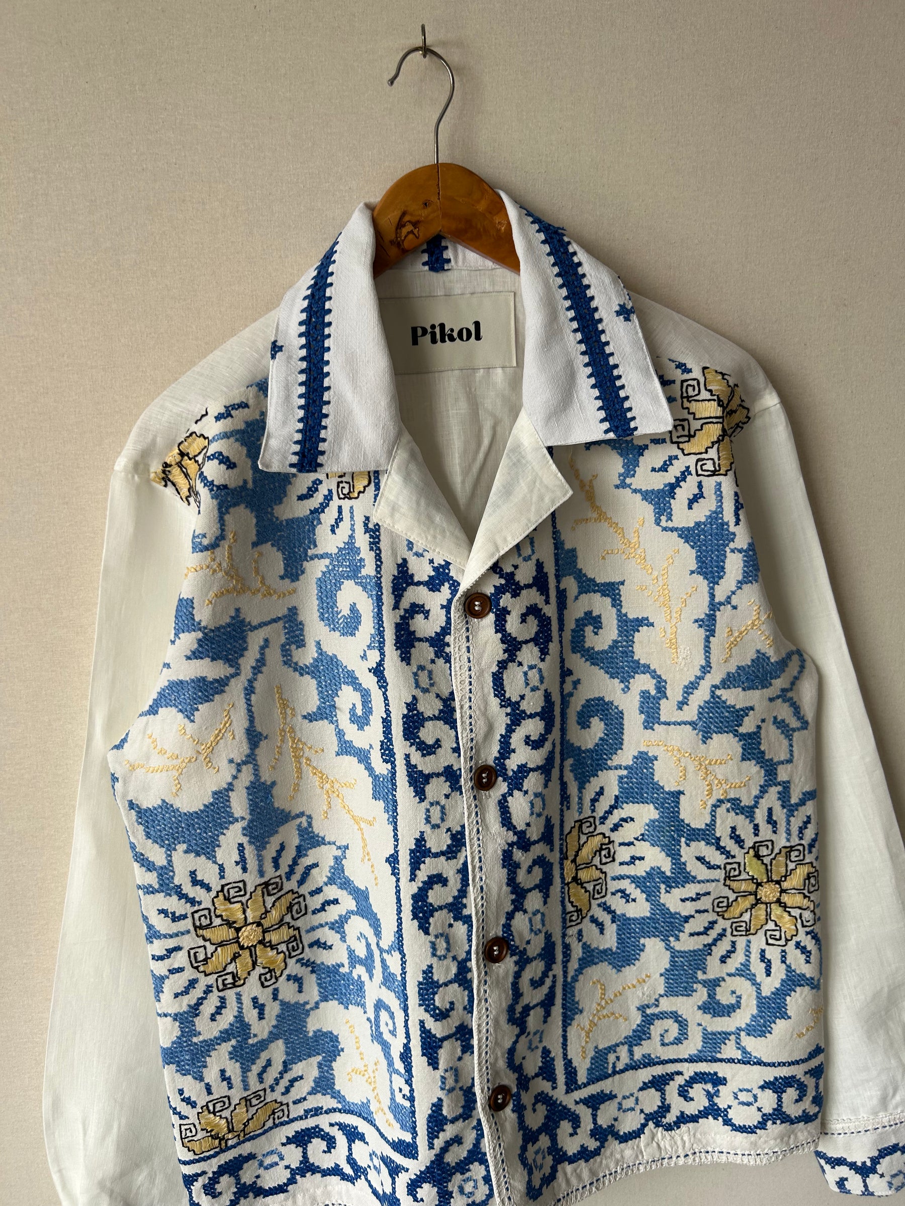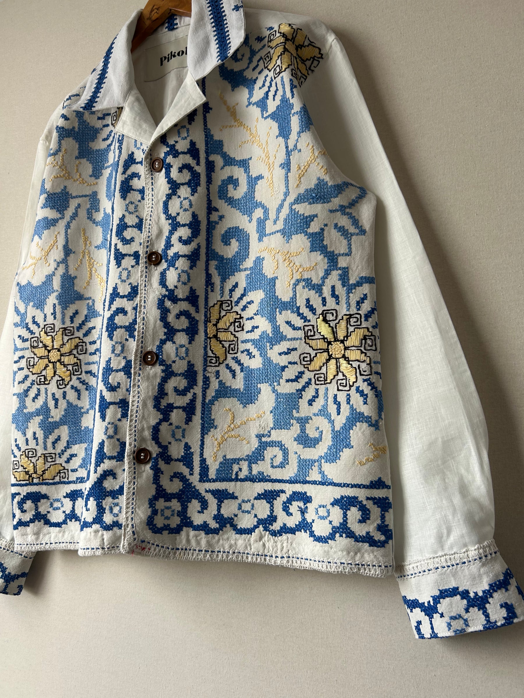 Detailed hand cross-stitched blue floral design on the front and cuffs