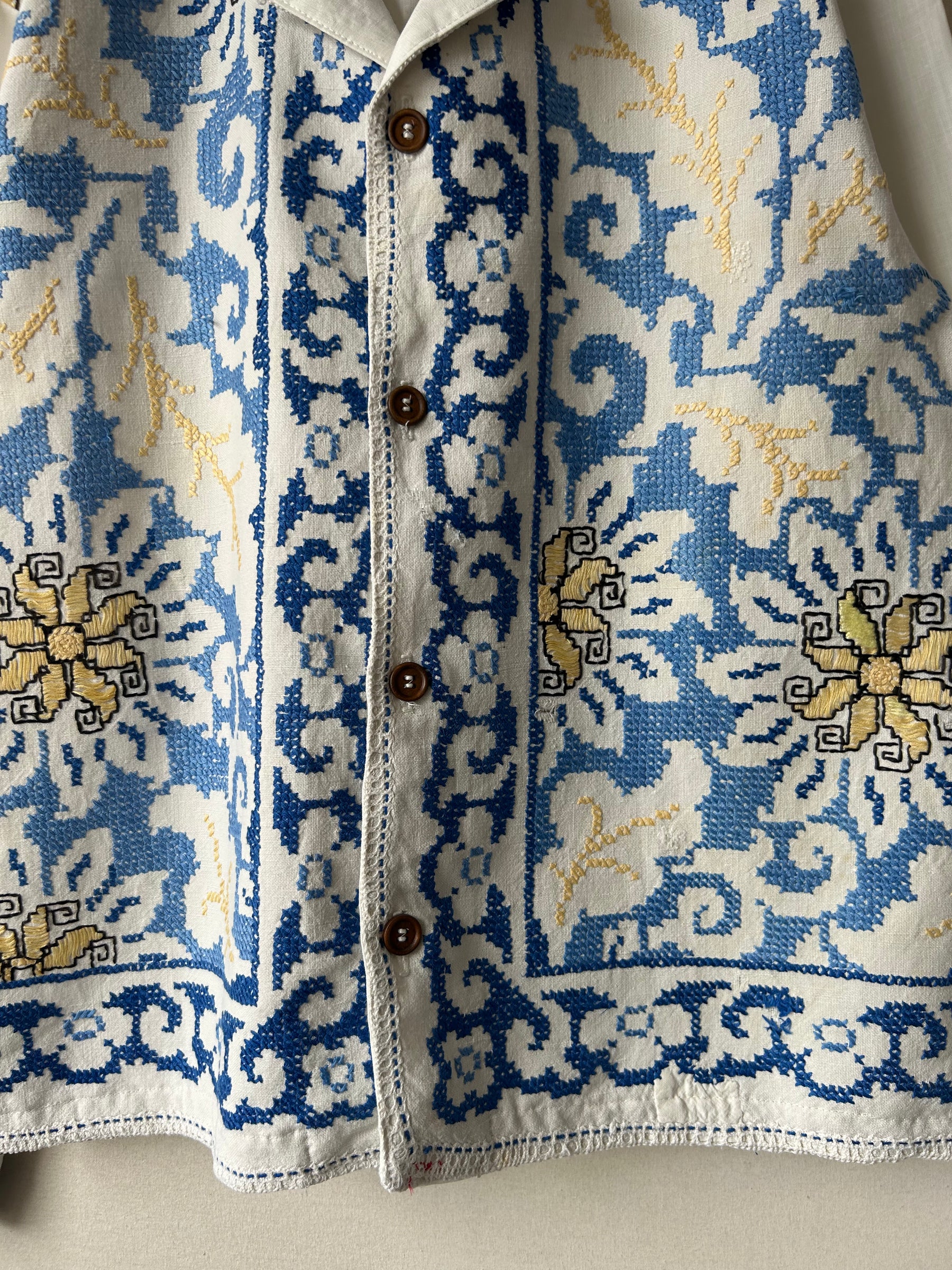 Shirt made from a vintage linen tablecloth. Fabric used may have slight imperfections