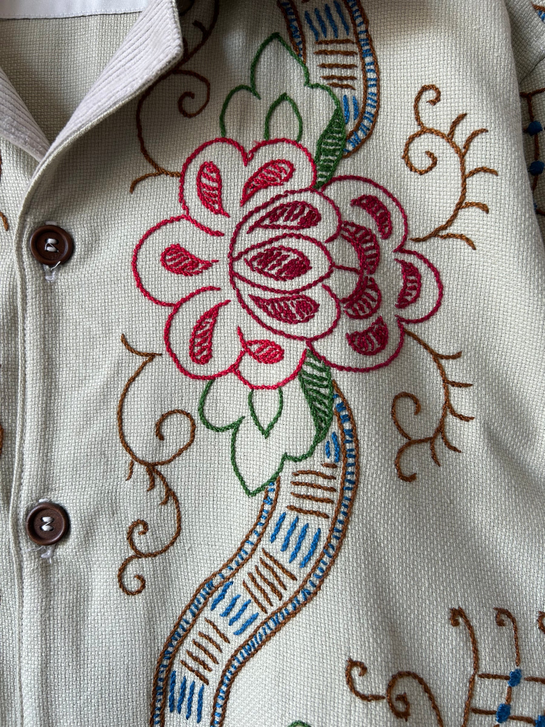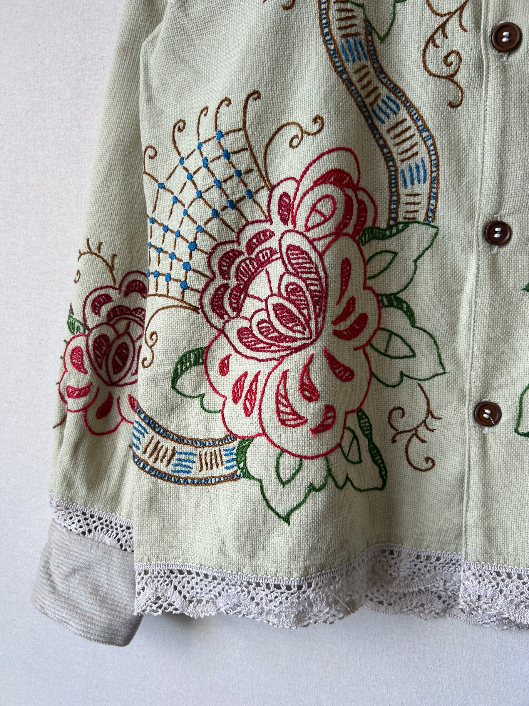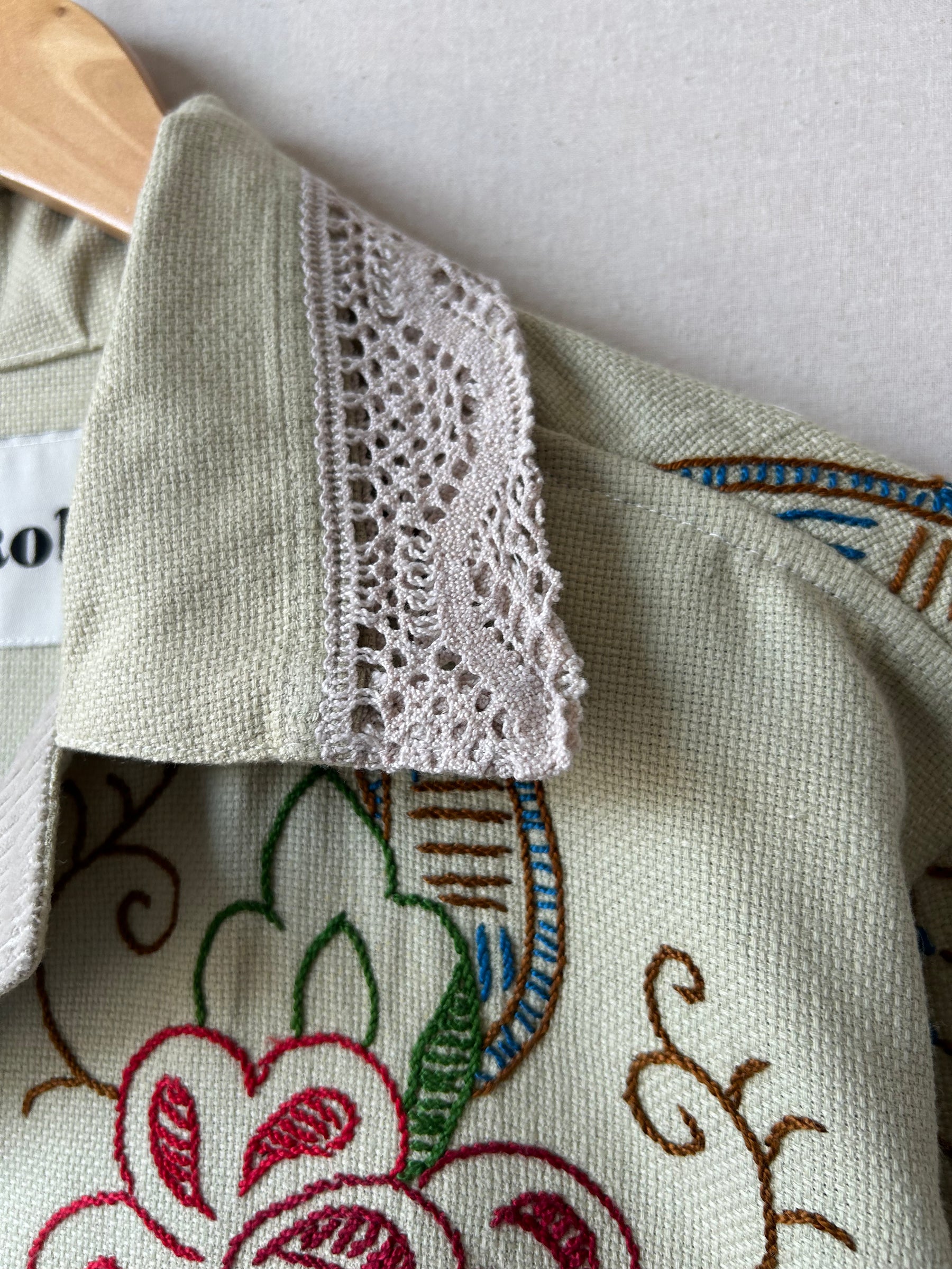 Detailed hand-embroidered flowers on the front, back and sleeves