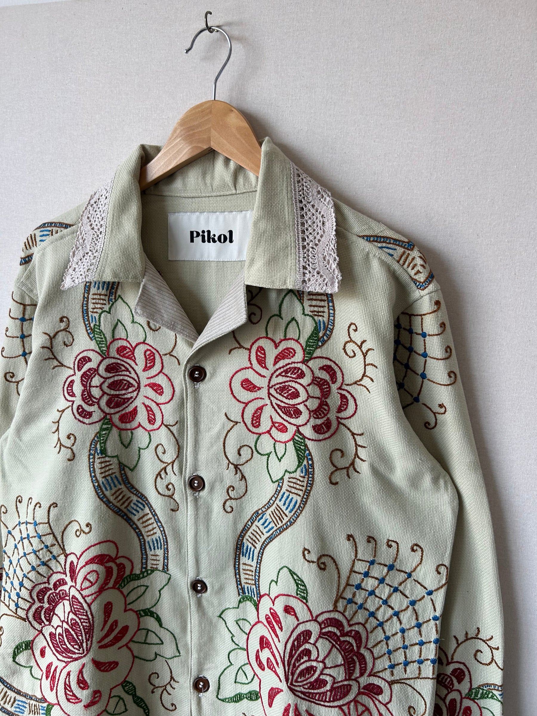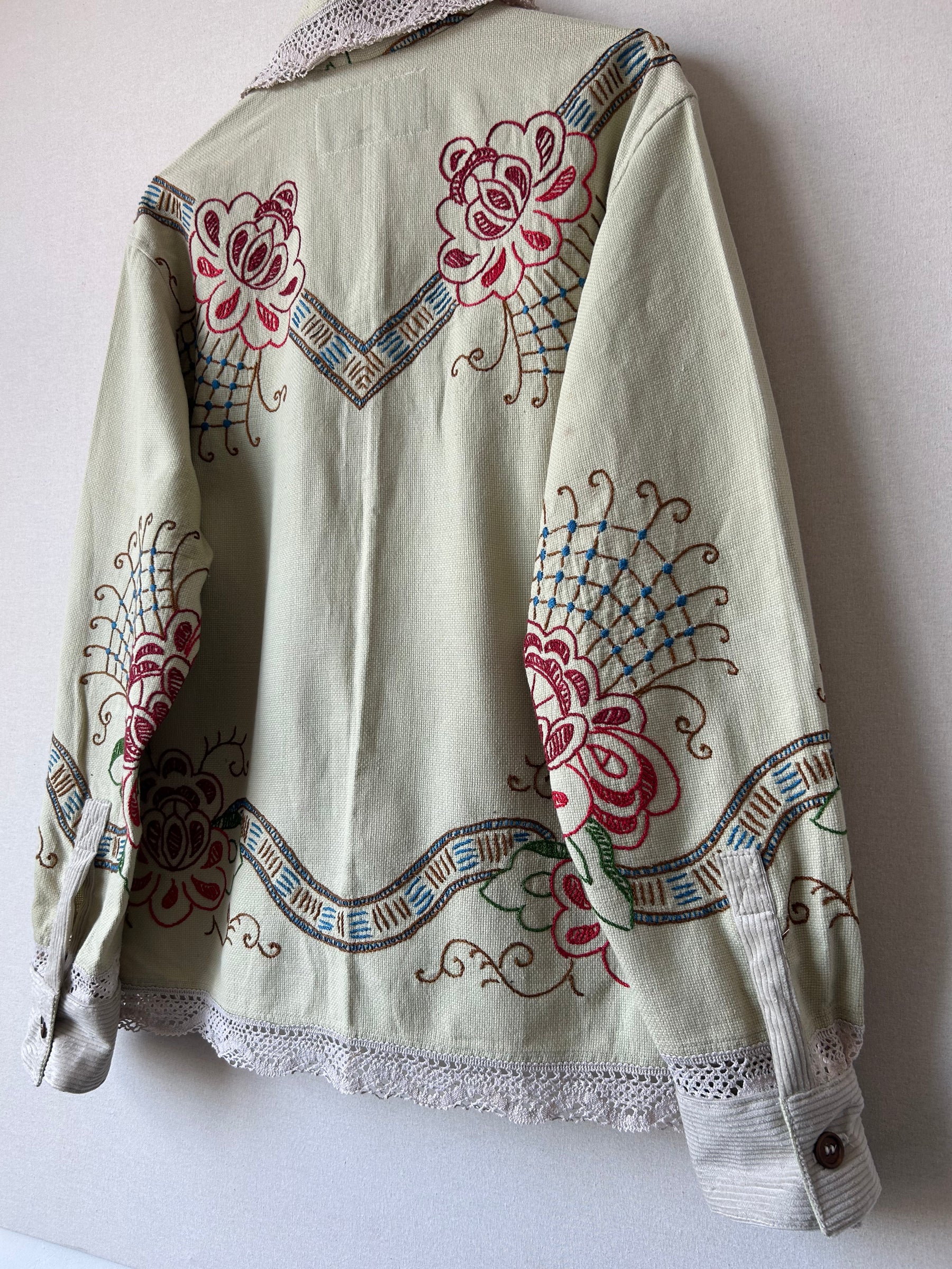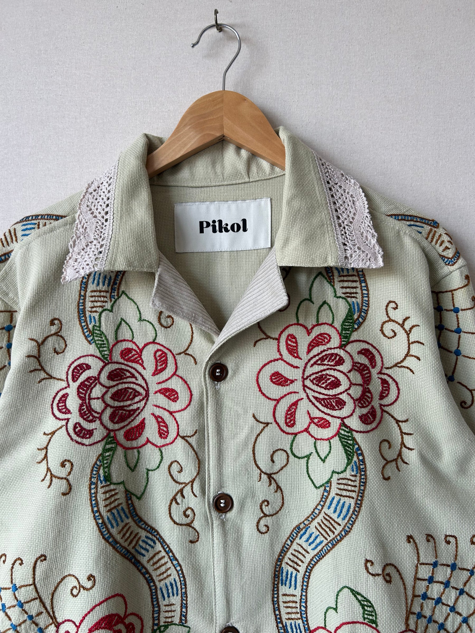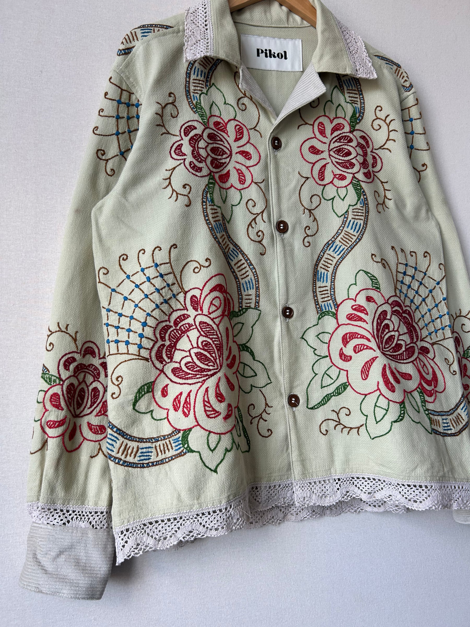 Detailed hand-embroidered flowers on the front, back and sleeves