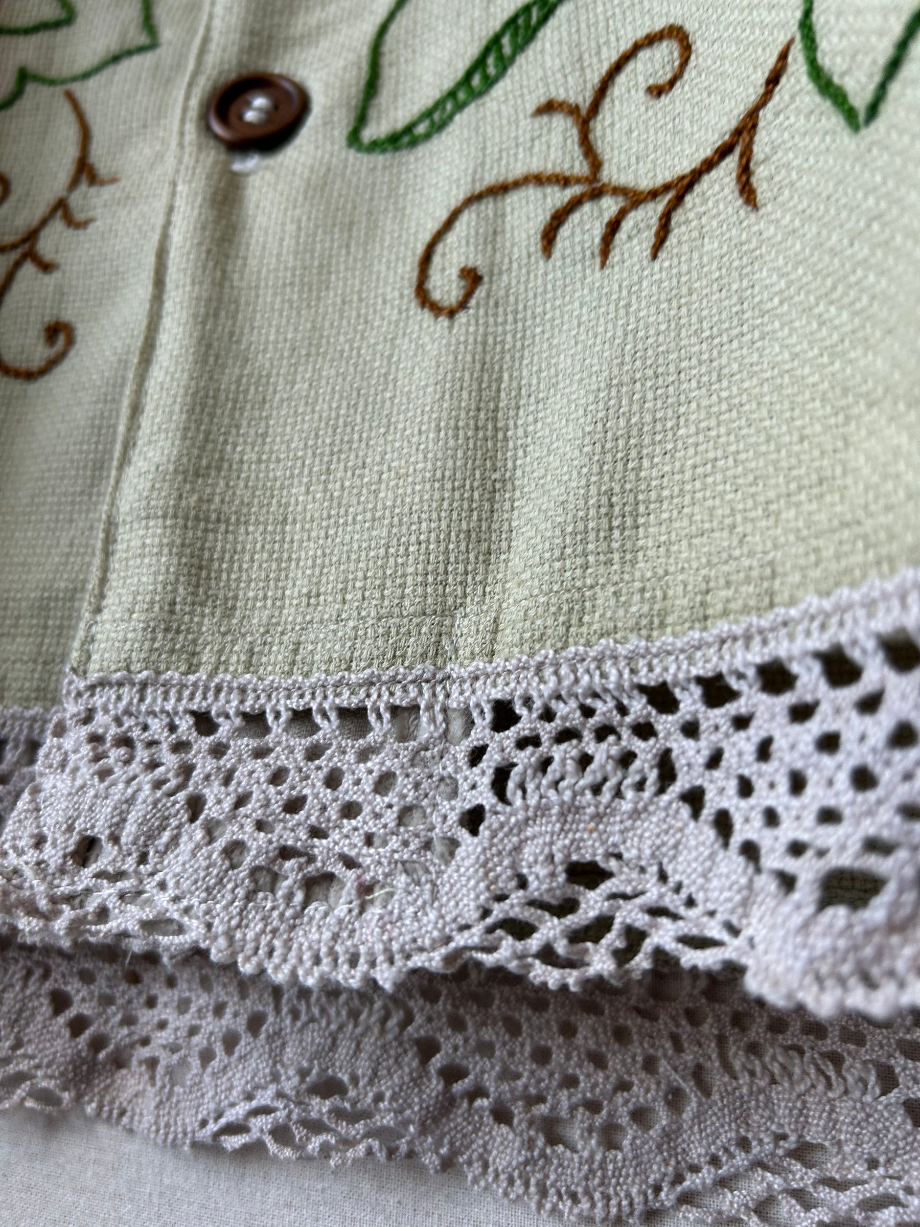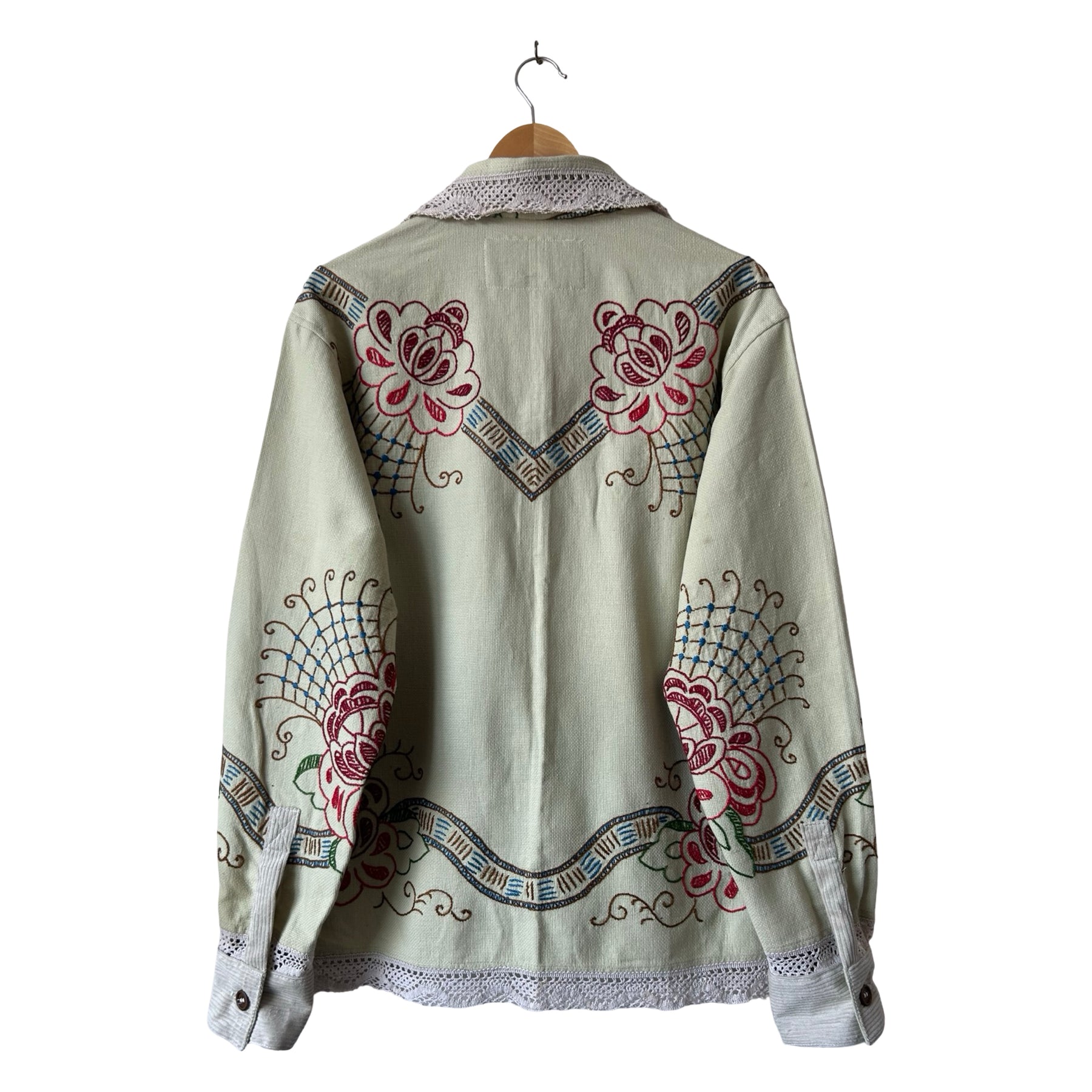 Shirt made from a vintage linen tablecloth. Fabric used may have slight imperfections
