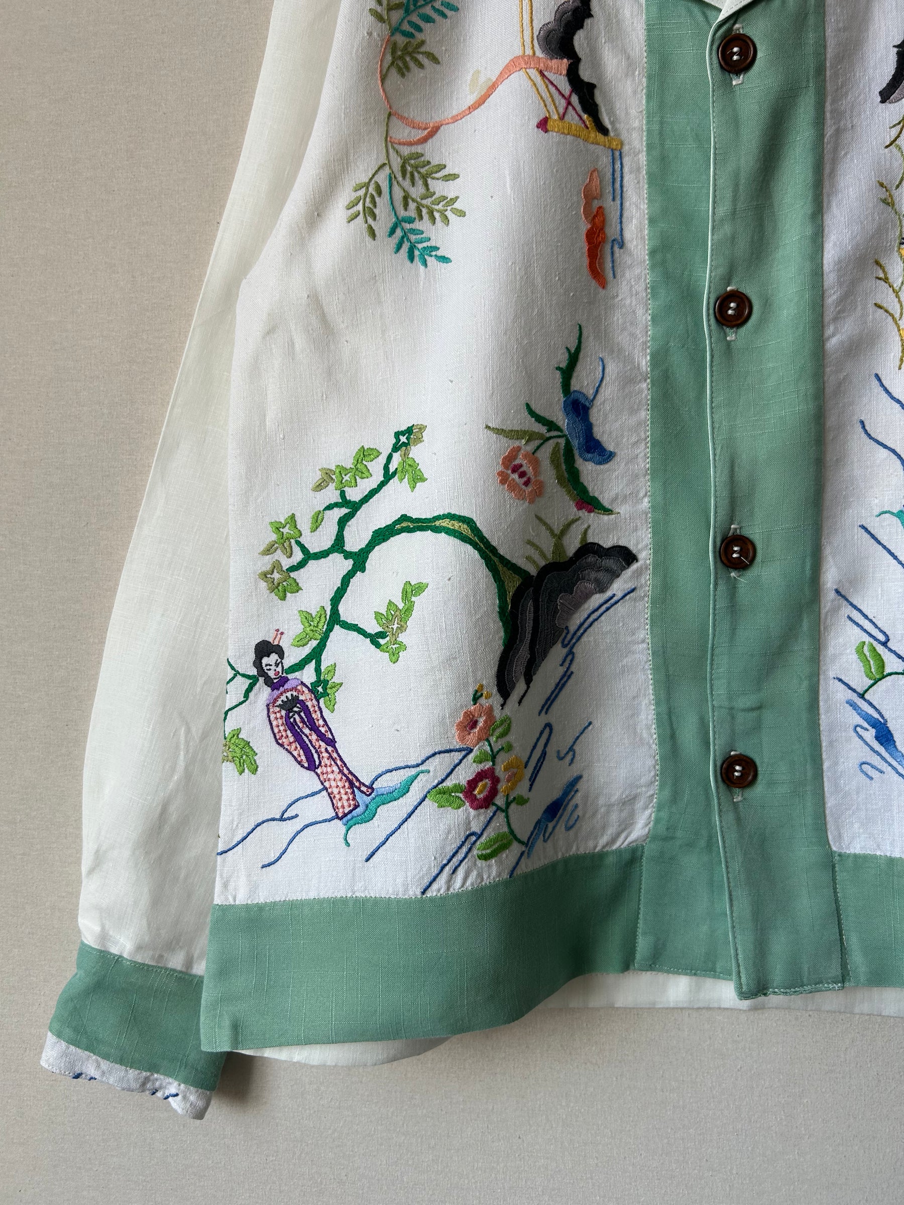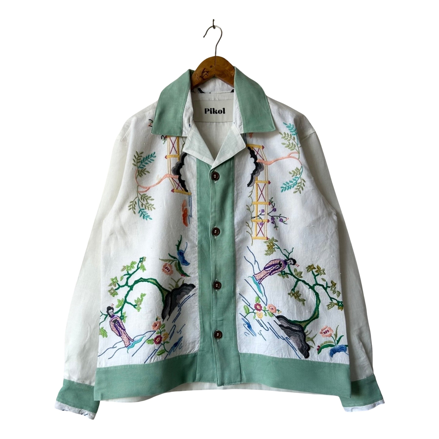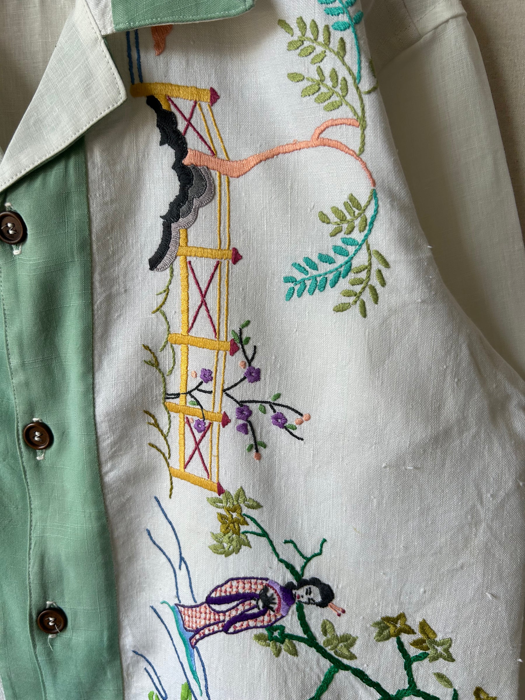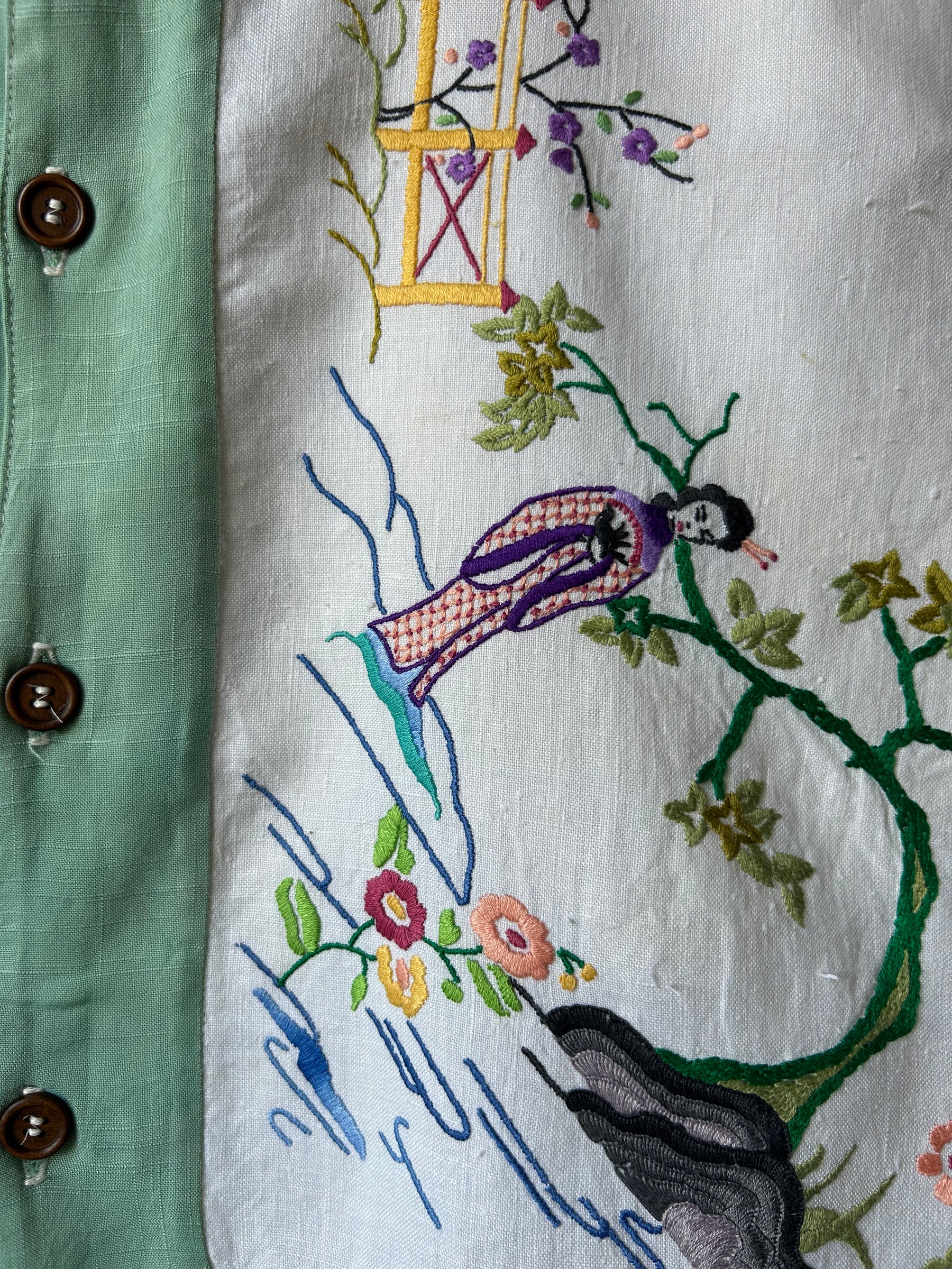 Shirt made from a vintage linen tablecloth. Fabric used may have slight imperfections