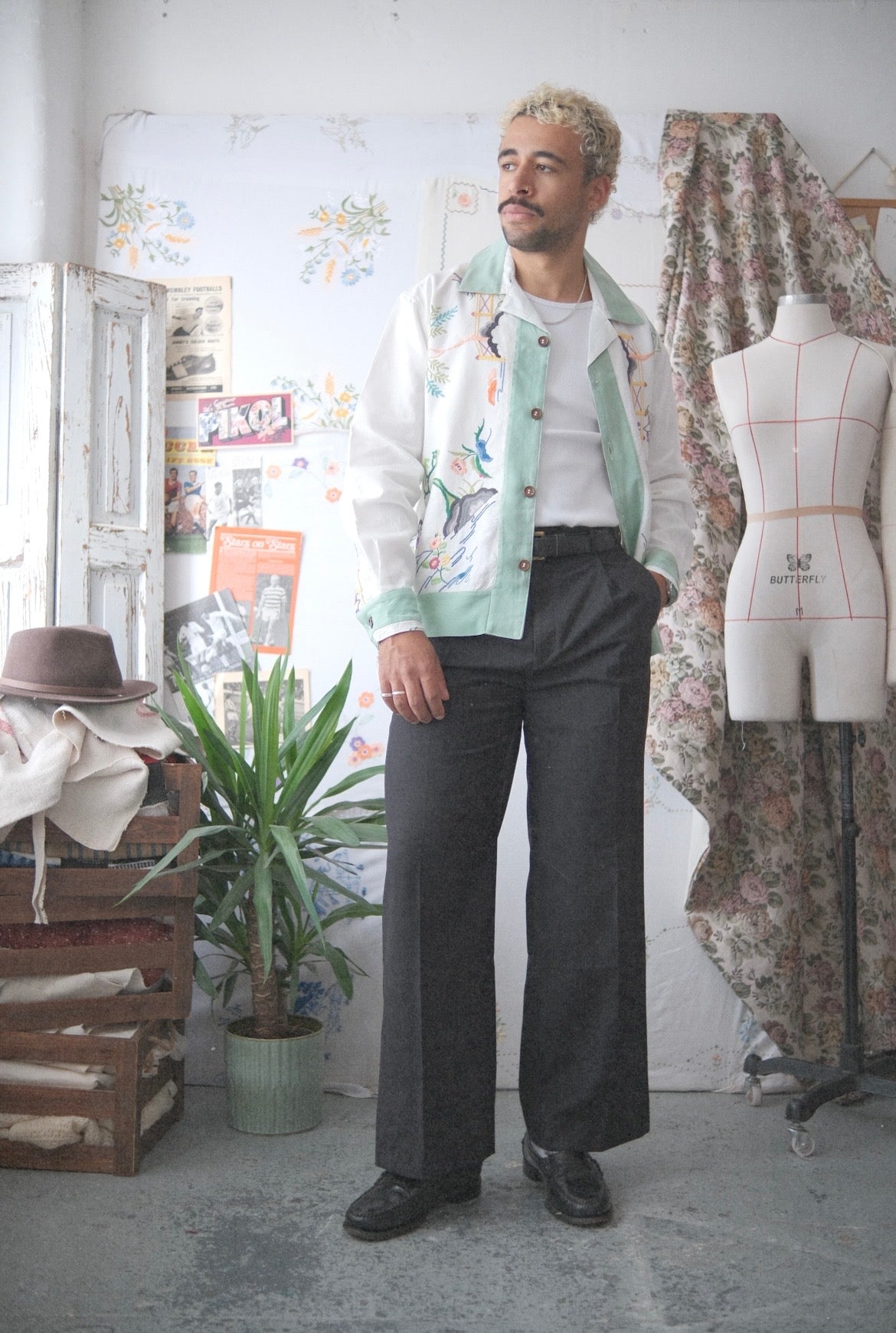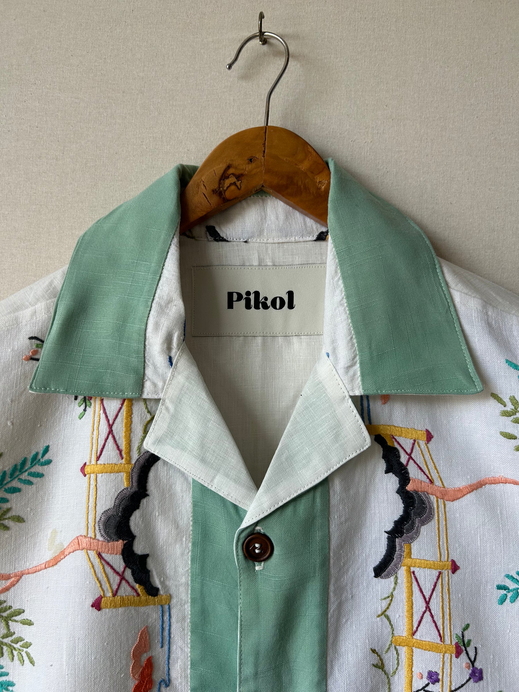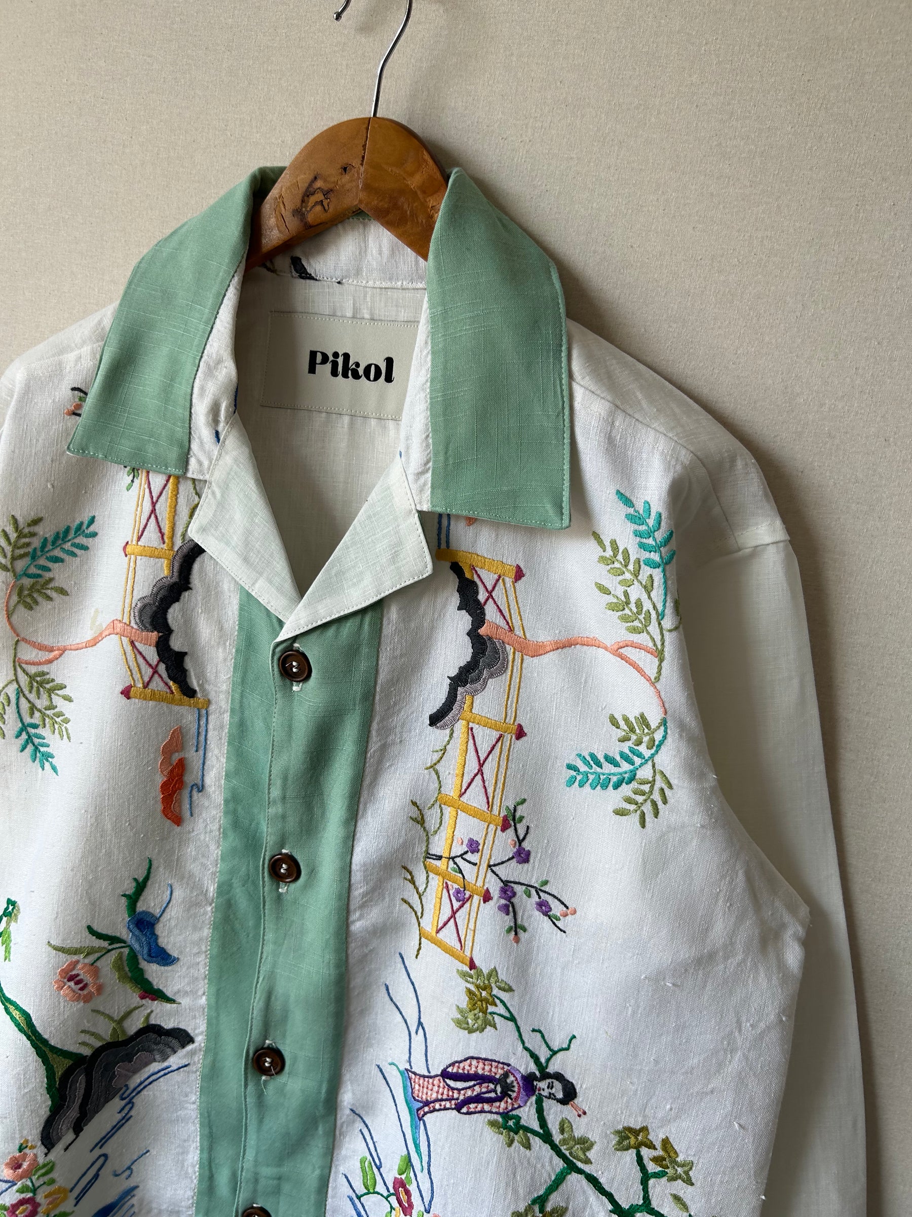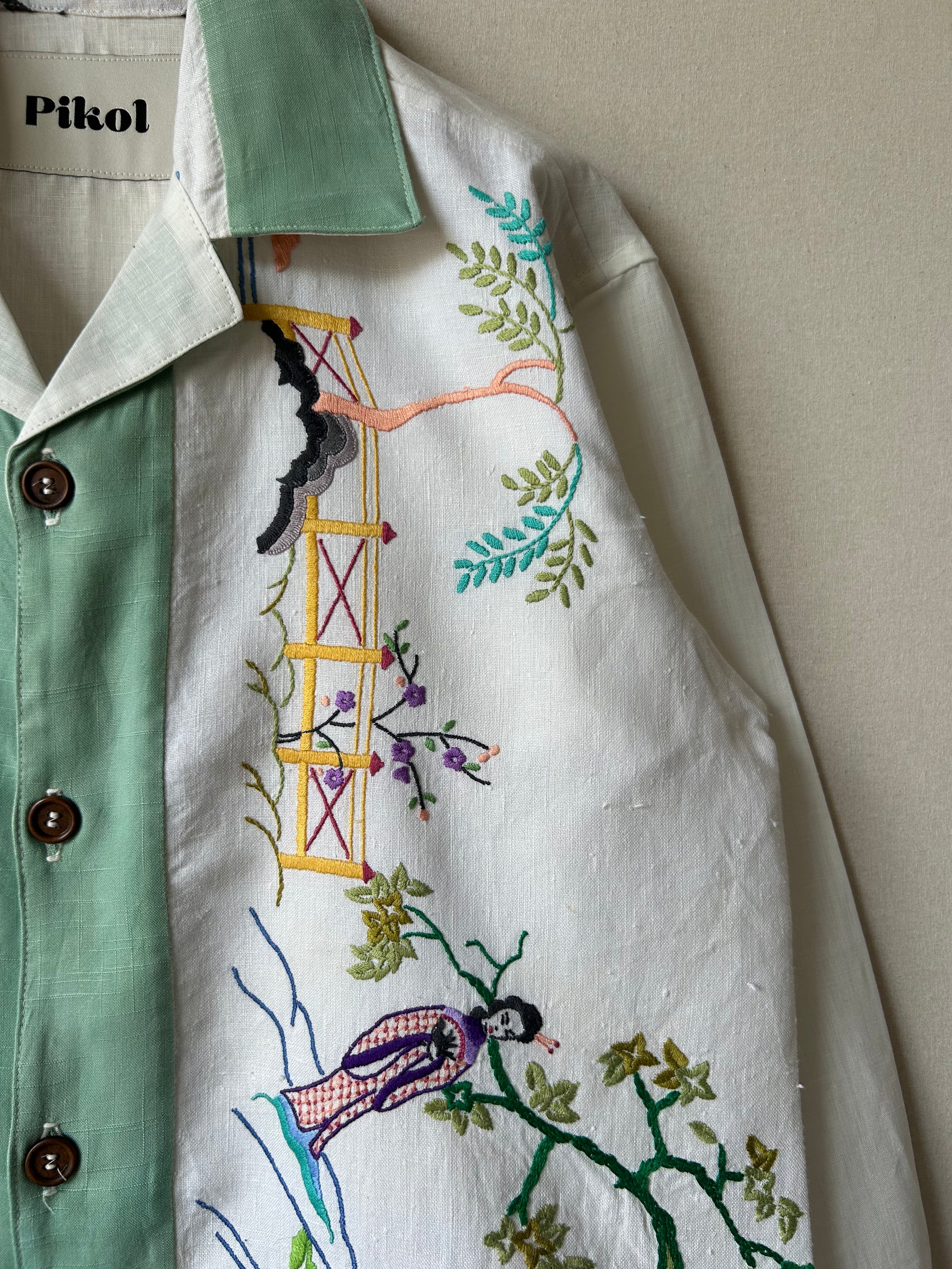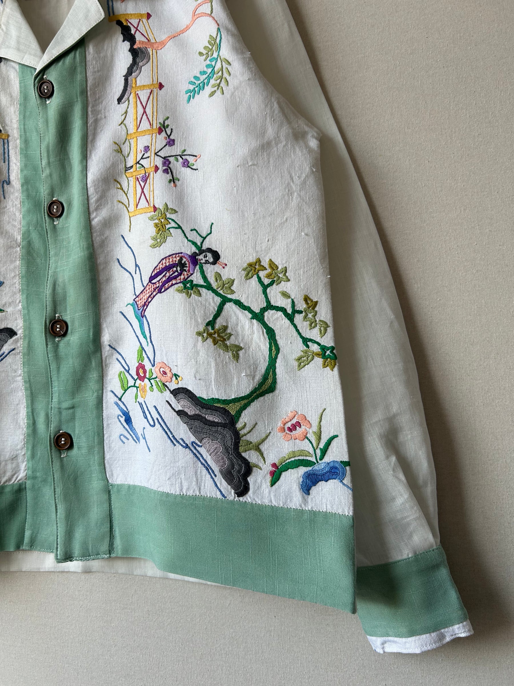 Shirt made from a vintage linen tablecloth. Fabric used may have slight imperfections